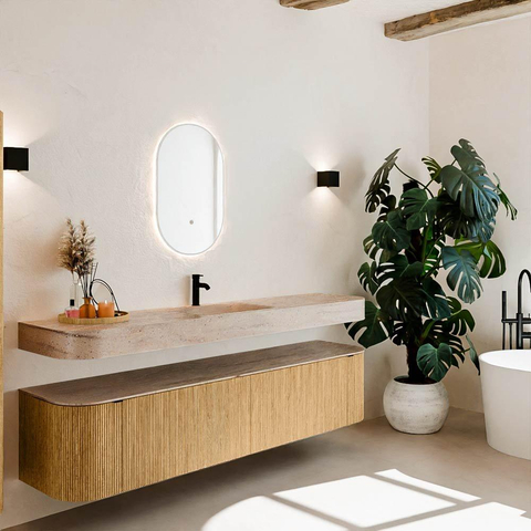 MONDIAZ THOR-DLUX 200cm meuble de salle de bains arrondi gauche + droite couleur Chêne avec 2 tiroirs et 2 portes. Vasque suspendue CLOUD Milieu 1 trou de robinet couleur Saba.