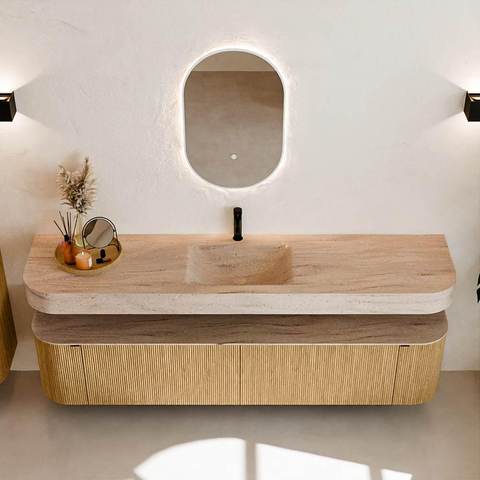 Au-dessus du meuble flotte une vasque suspendue assortie aux coins arrondis – parfaitement adaptée à la forme du meuble. La vasque est réalisée en Solid Surface et suit subtilement les lignes du meuble inférieur, créant ainsi un ensemble harmonieux. Le plan de travail en Solid Surface forme une base solide, facile d'entretien et complète la combinaison.