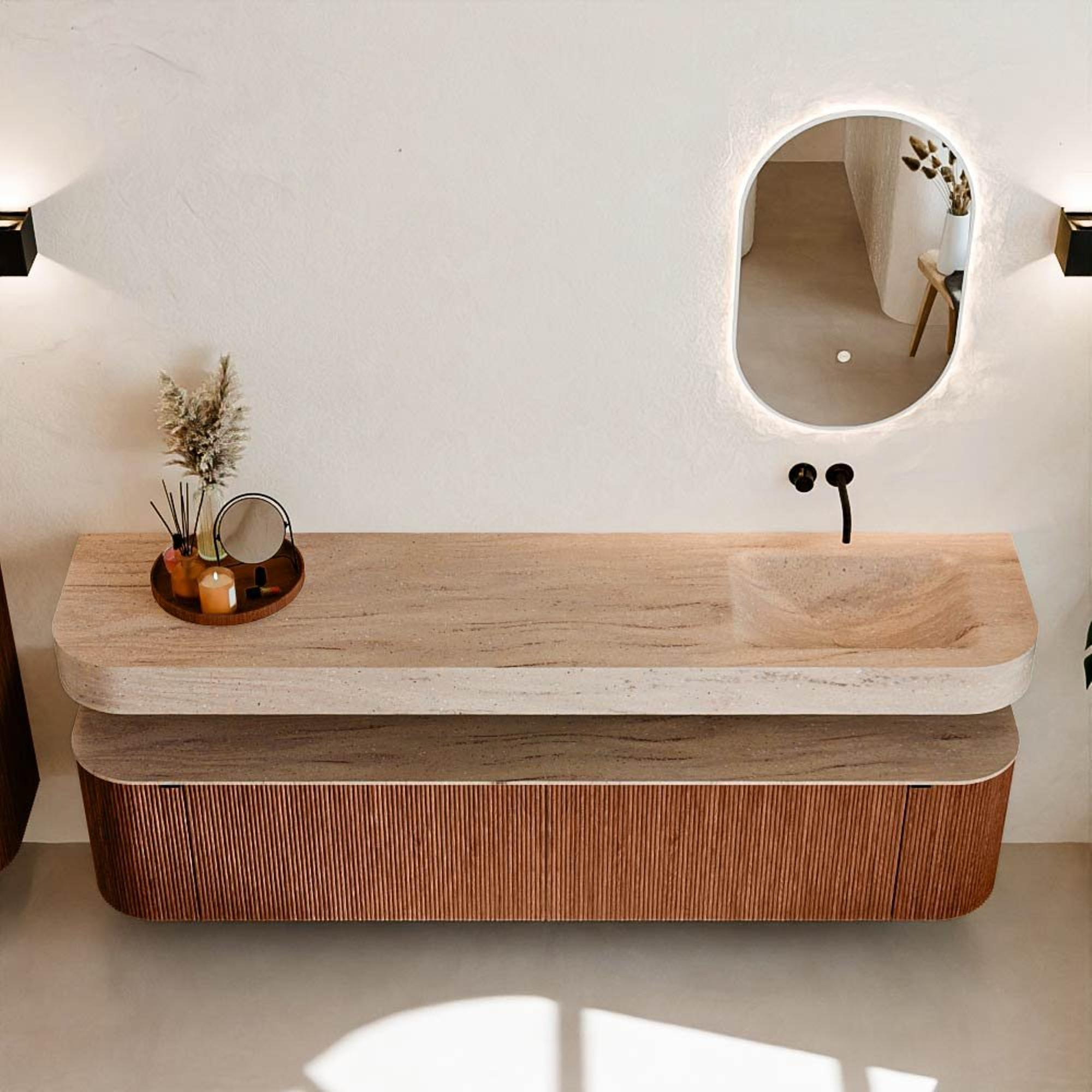 Au-dessus du meuble flotte une vasque suspendue assortie aux coins arrondis – parfaitement adaptée à la forme du meuble. La vasque est réalisée en Solid Surface et suit subtilement les lignes du meuble inférieur, créant ainsi un ensemble harmonieux. Le plan de travail en Solid Surface forme une base solide et facile d'entretien et complète la combinaison.