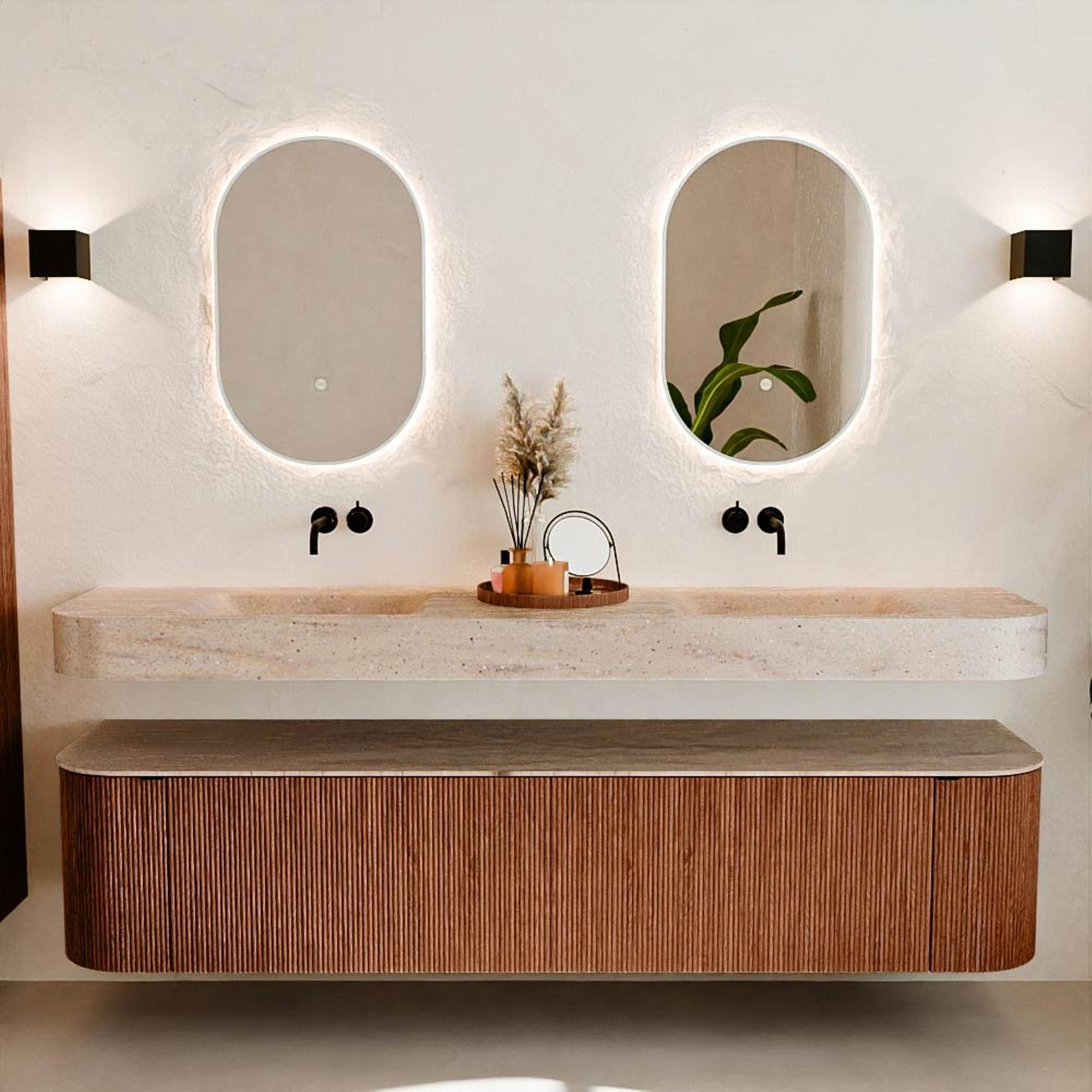 Matériaux naturels aux teintes chaudes. Les rainures verticales apportent rythme et texture au design, tandis que le chêne confère une apparence chaleureuse et artisanale. Choisissez parmi 5 teintes de bois OAK, WALNUT, DUSK, SHADOW et RUBY, des couleurs de bois soigneusement sélectionnées pour enrichir les salles de bains modernes et classiques.