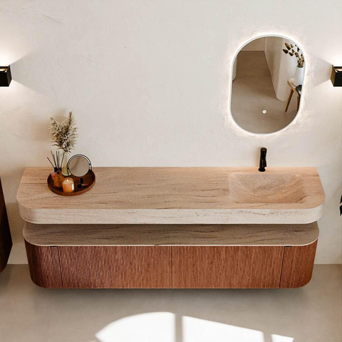 Matériaux naturels dans des tons chauds. Les nervures verticales apportent rythme et texture au design, tandis que le chêne confère une apparence chaleureuse et artisanale. Choisissez parmi 5 teintes de bois OAK, WALNUT, DUSK, SHADOW et RUBY, des couleurs de bois soigneusement sélectionnées pour enrichir les salles de bains modernes et classiques.