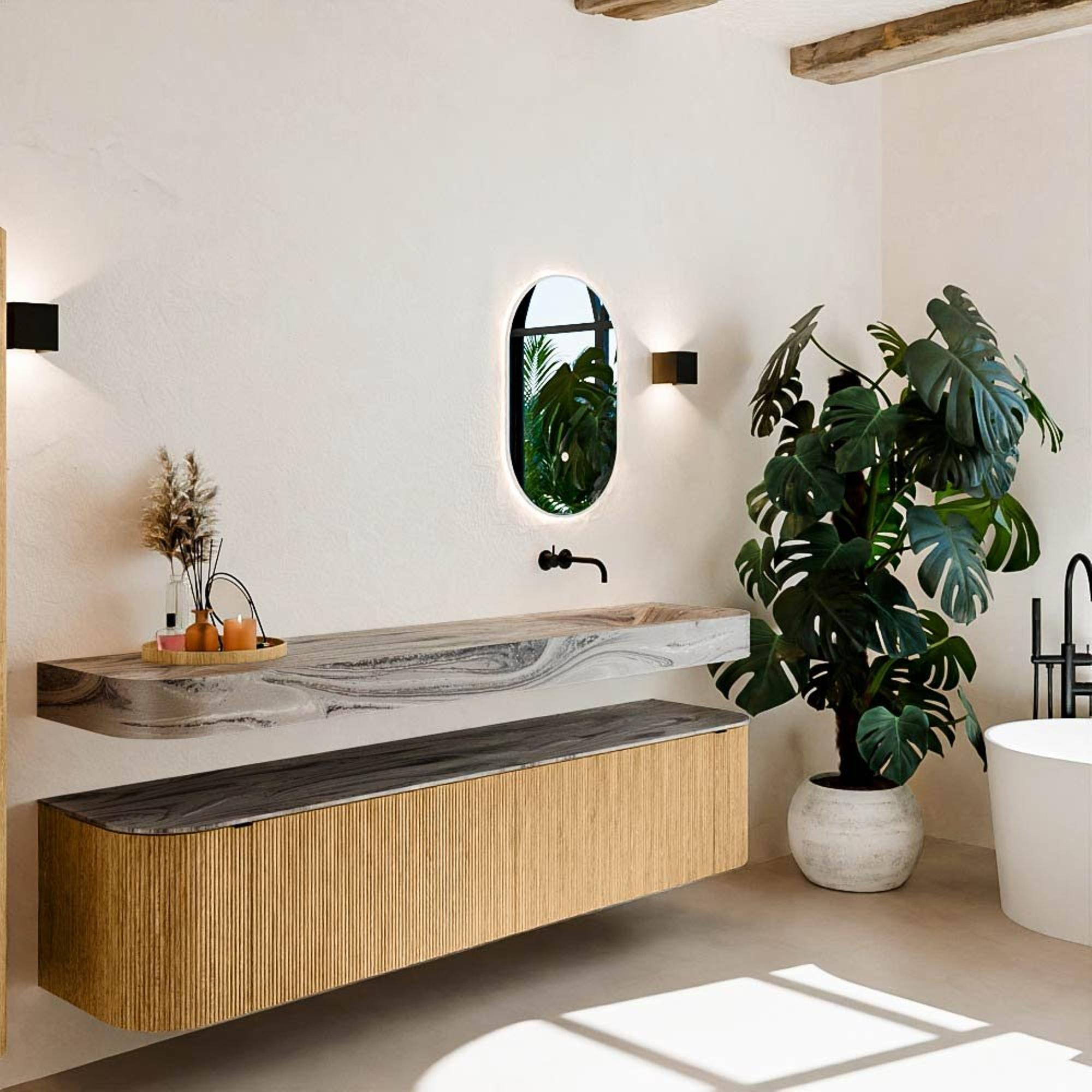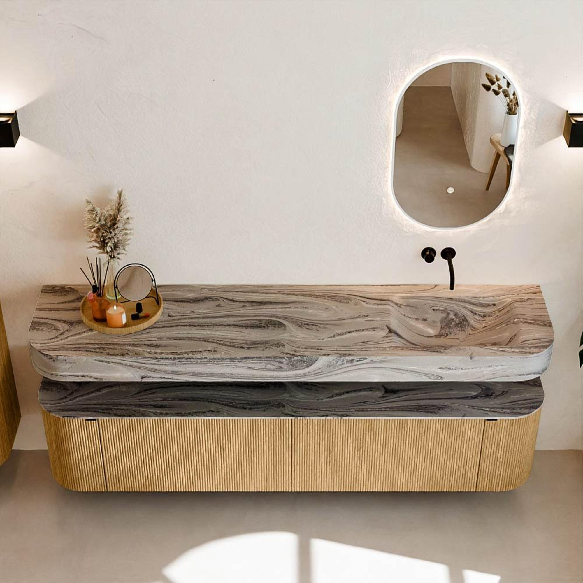 MONDIAZ THOR-DLUX 200cm meuble de salle de bains arrondi gauche + droite couleur Oak avec 2 tiroirs et 2 portes. Vasque suspendue CLOUD droite sans trou de robinet couleur Sombra.