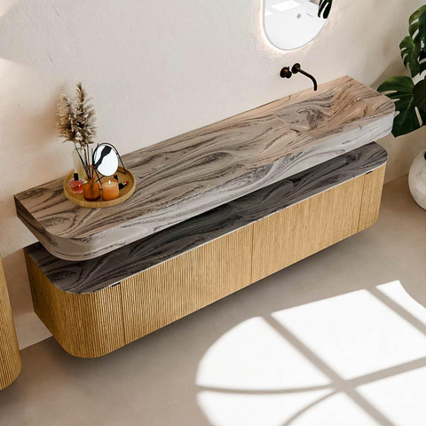 Matériaux naturels dans des tons chauds. Les nervures verticales apportent rythme et texture au design, tandis que le chêne confère une apparence chaleureuse et artisanale. Choisissez parmi 5 teintes de bois OAK, WALNUT, DUSK, SHADOW et RUBY, des couleurs de bois soigneusement sélectionnées pour enrichir les salles de bains modernes et classiques.