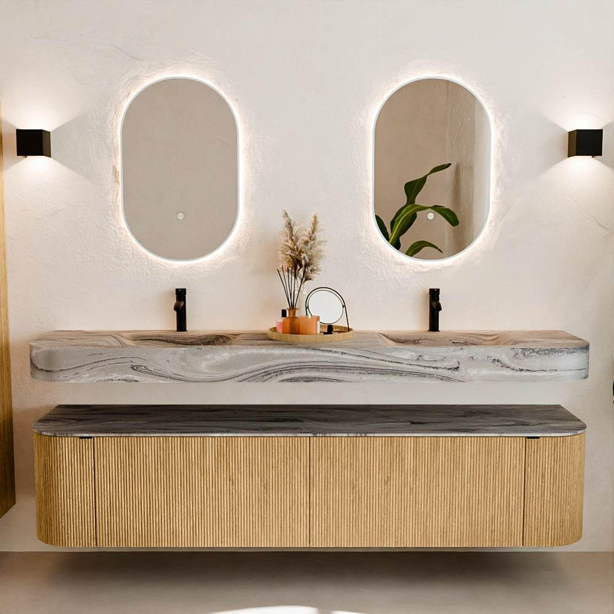 MONDIAZ THOR-DLUX 200cm meuble de salle de bains arrondi gauche + droite couleur Oak avec 2 tiroirs et 2 portes. Vasque suspendue CLOUD Double 2 trous de robinet couleur Sombra.