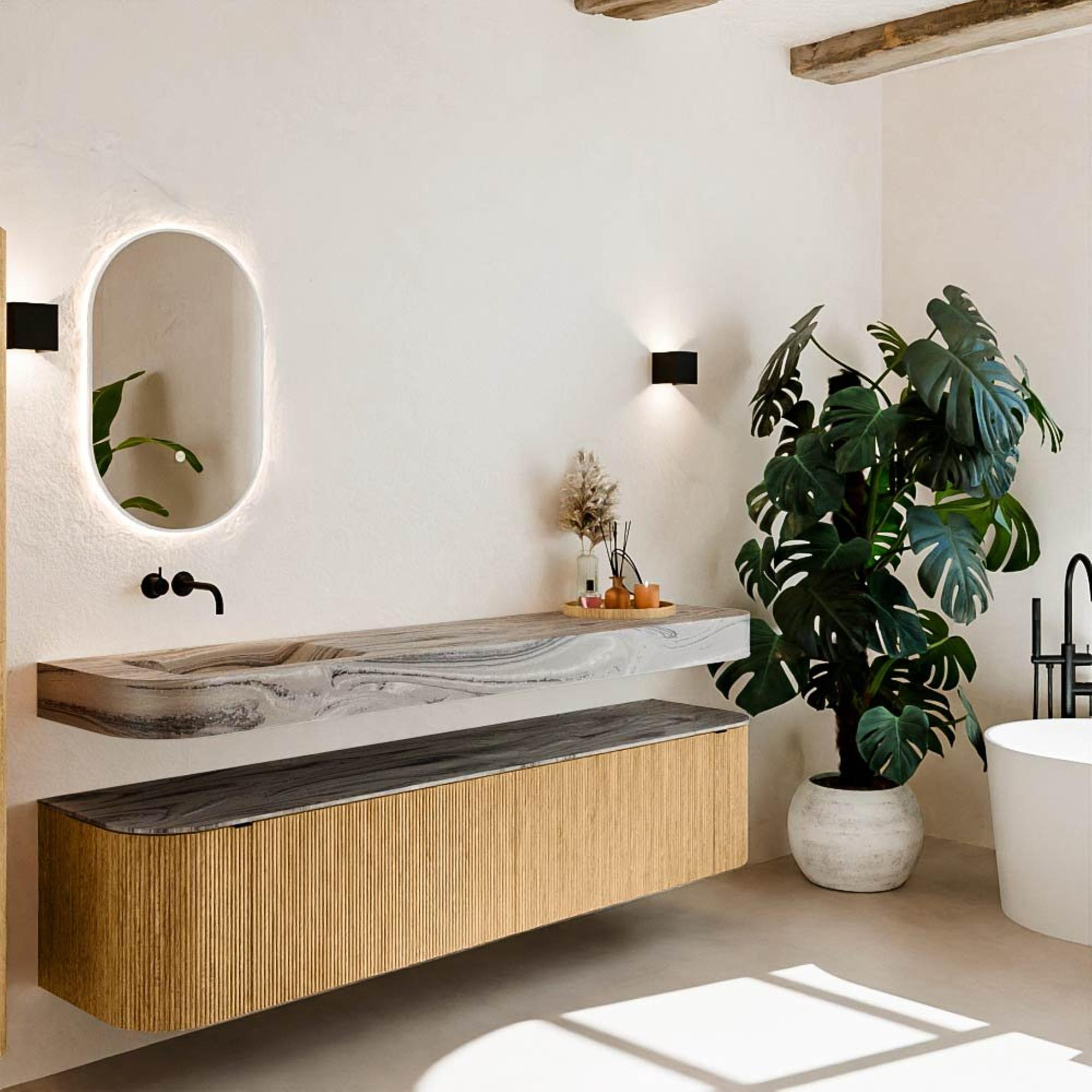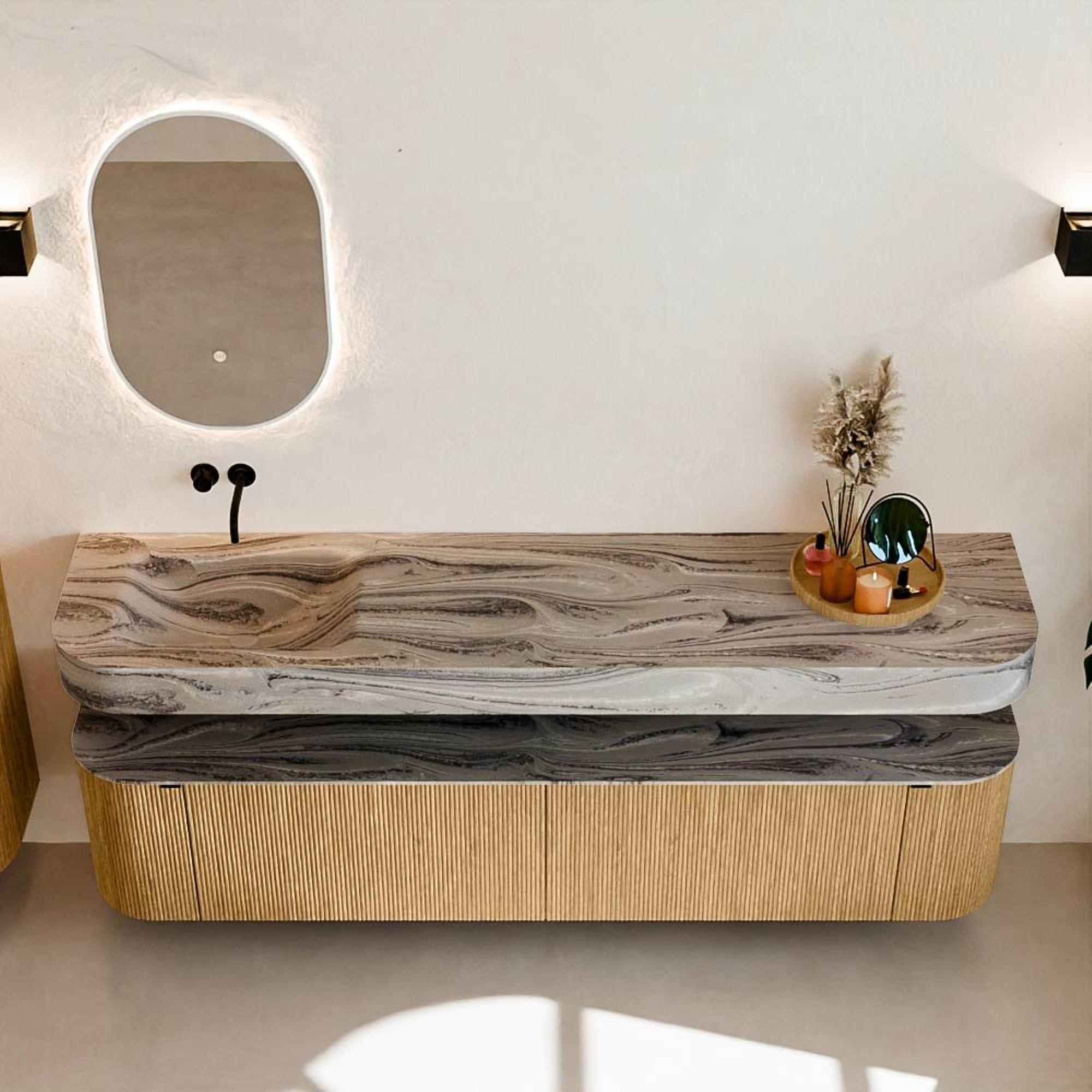 Matériaux naturels dans des tons chauds. Les cannelures verticales apportent rythme et texture au design, tandis que le chêne confère une apparence chaleureuse et artisanale. Choisissez parmi 5 teintes de bois OAK, WALNUT, DUSK, SHADOW et RUBY, des couleurs de bois soigneusement sélectionnées pour enrichir les salles de bains modernes et classiques.