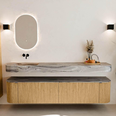 MONDIAZ THOR-DLUX 200cm meuble de salle de bains arrondi gauche + droite couleur Oak avec 2 tiroirs et 2 portes. Vasque suspendue CLOUD Gauche sans trou de robinet couleur Sombra.