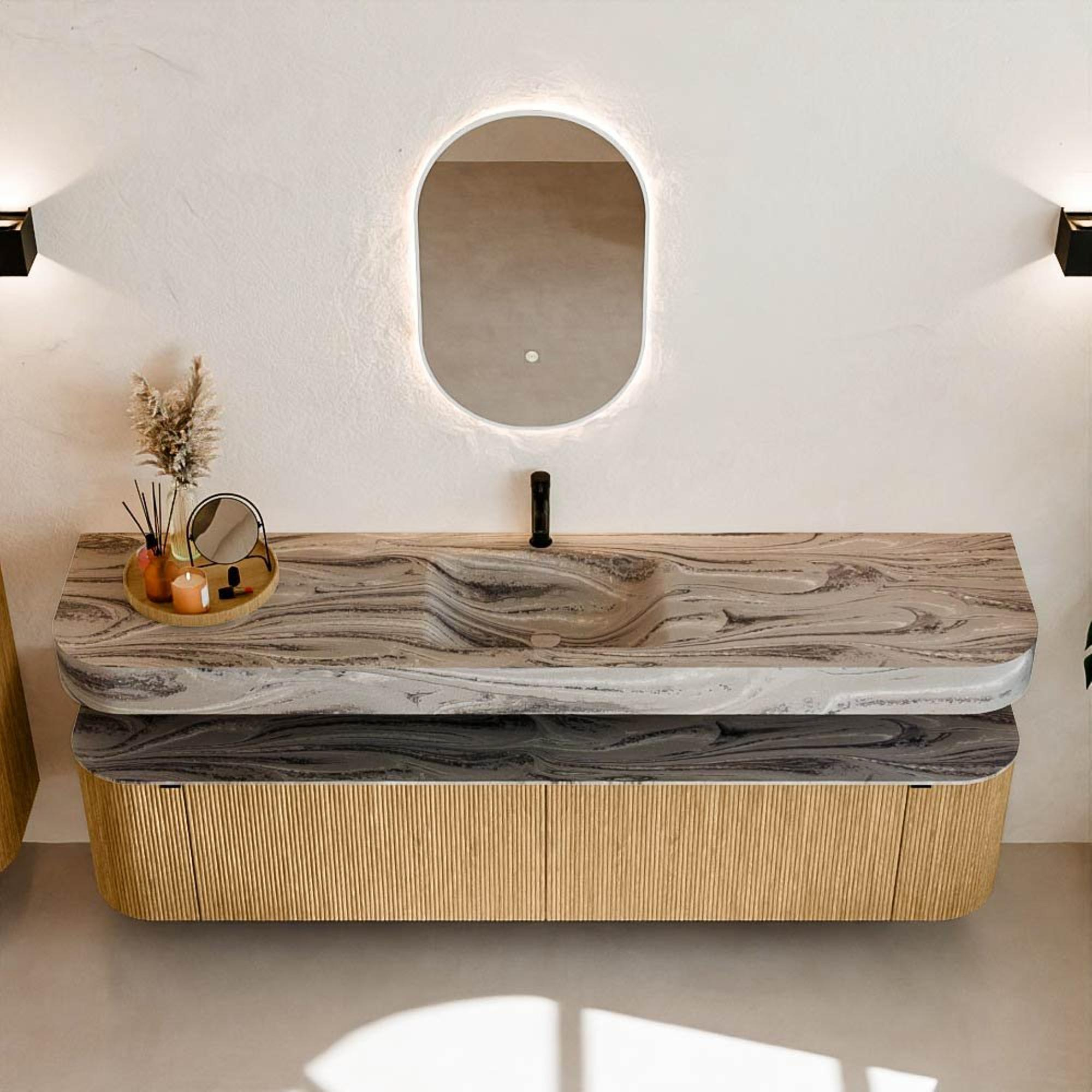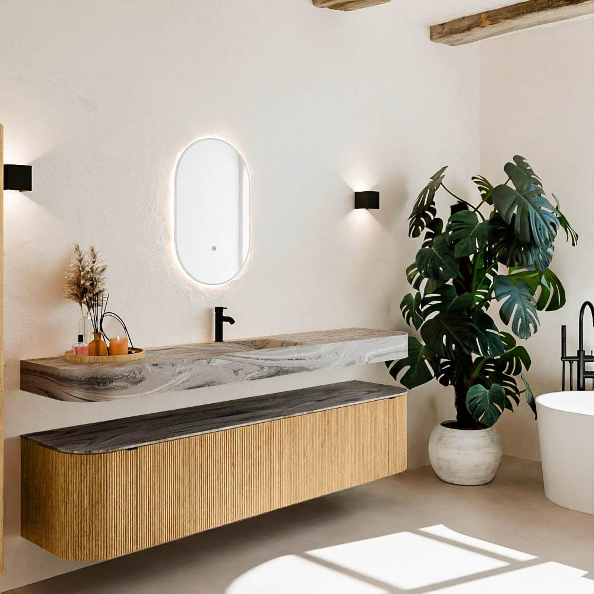 Matériaux naturels aux teintes chaudes. Les cannelures verticales apportent rythme et texture au design, tandis que le chêne confère une apparence chaleureuse et artisanale. Choisissez parmi 5 teintes de bois OAK, WALNUT, DUSK, SHADOW et RUBY, des couleurs de bois soigneusement sélectionnées pour enrichir les salles de bains modernes et classiques.