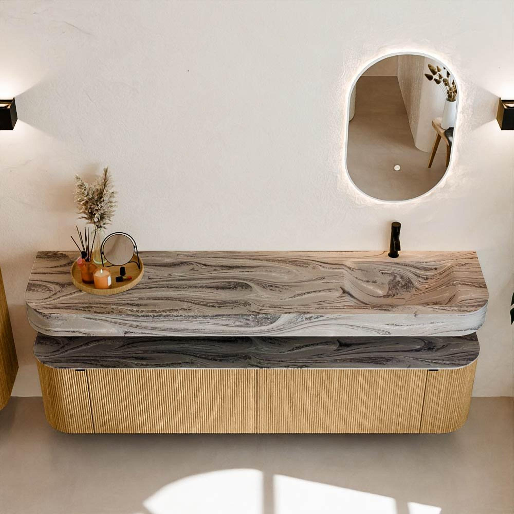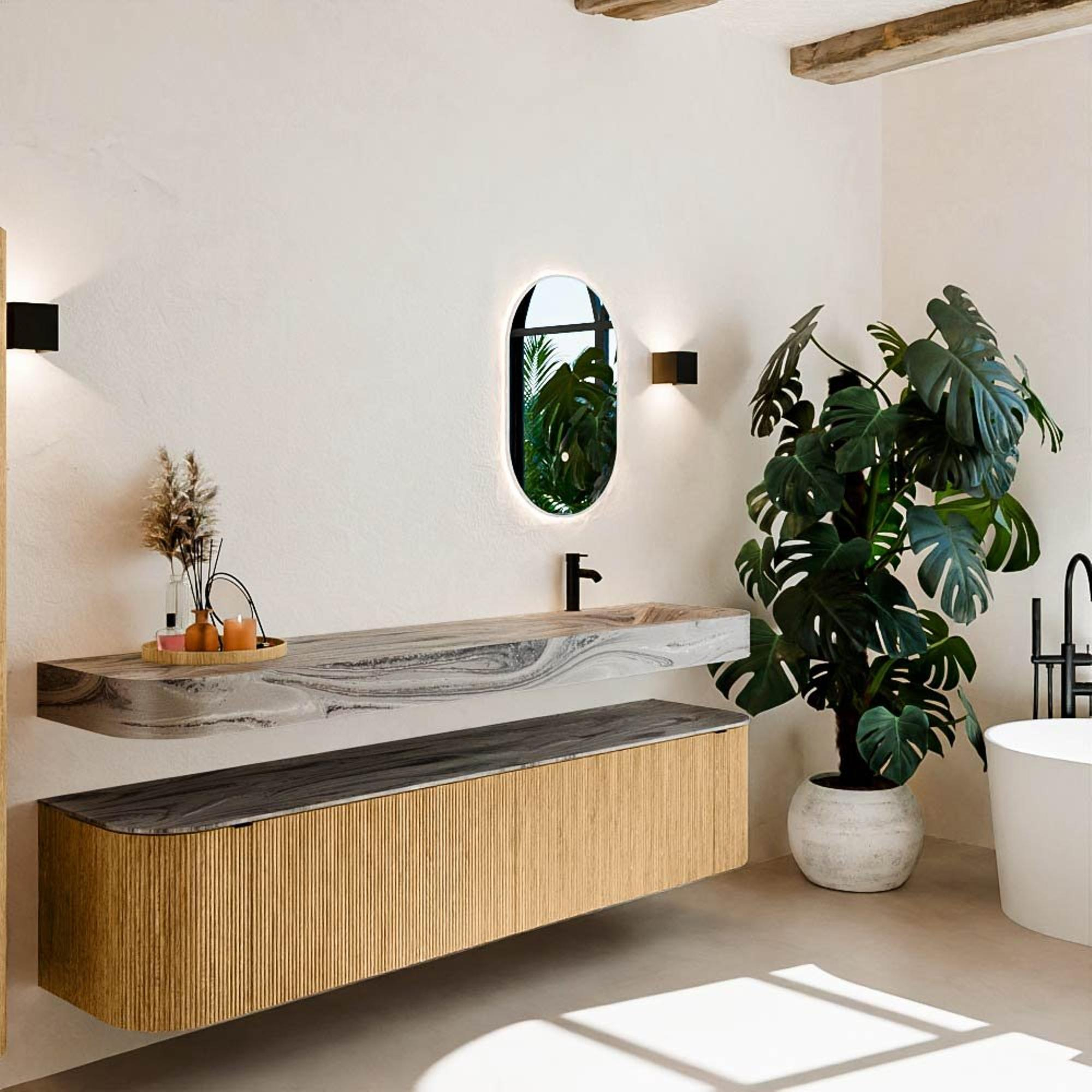 Matériaux naturels dans des tons chauds. Les nervures verticales apportent rythme et texture au design, tandis que le chêne confère une apparence chaleureuse et artisanale. Choisissez parmi 5 teintes de bois OAK, WALNUT, DUSK, SHADOW et RUBY, des couleurs de bois soigneusement sélectionnées pour enrichir les salles de bains modernes et classiques.