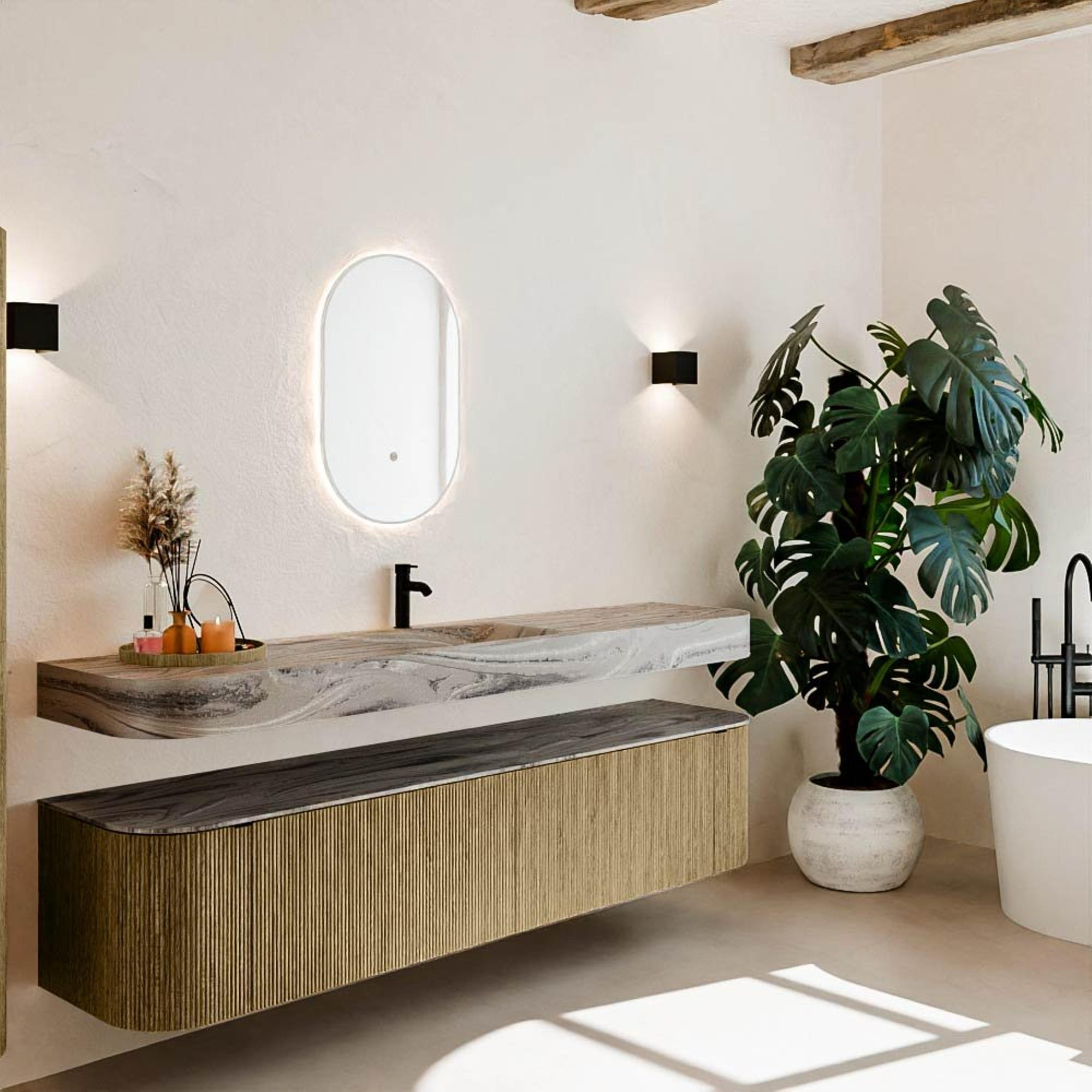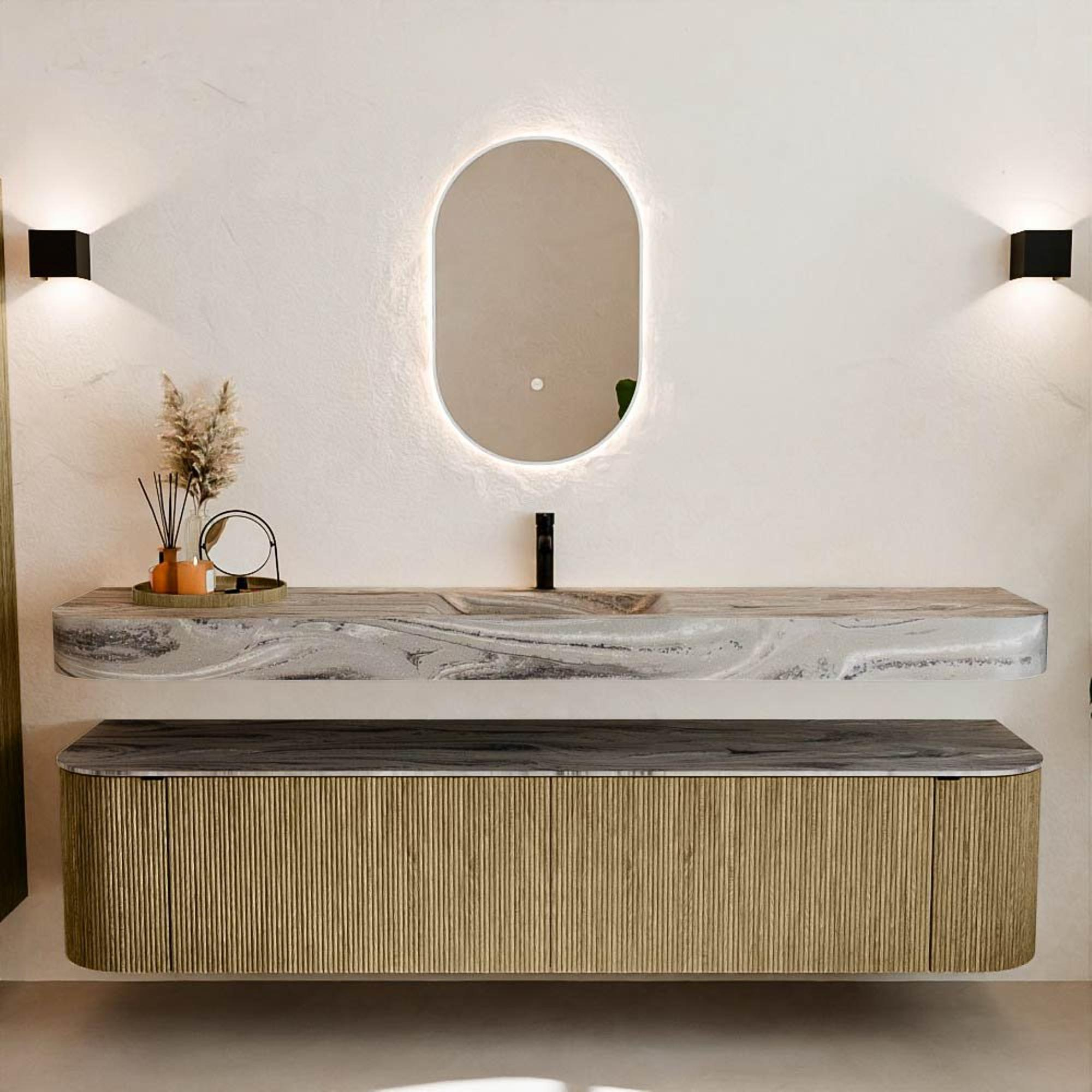Matériaux naturels dans des tons chauds. Les nervures verticales apportent rythme et texture au design, tandis que le chêne confère une apparence chaleureuse et artisanale. Choisissez parmi 5 teintes de bois OAK, WALNUT, DUSK, SHADOW et RUBY, des couleurs de bois soigneusement sélectionnées pour enrichir les salles de bains modernes et classiques.