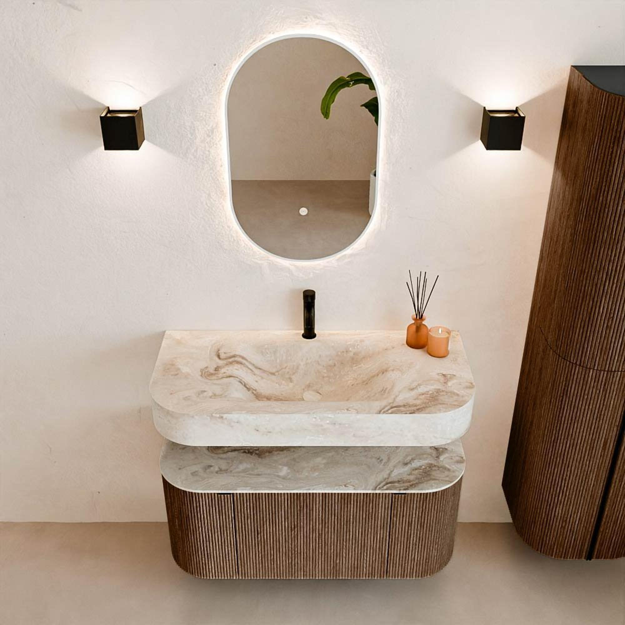 Matériaux naturels dans des tons chauds. Les nervures verticales apportent rythme et texture au design, tandis que le chêne confère une apparence chaleureuse et artisanale. Choisissez parmi 5 teintes de bois OAK, WALNUT, DUSK, SHADOW et RUBY, des couleurs de bois soigneusement sélectionnées pour enrichir les salles de bains modernes et classiques.