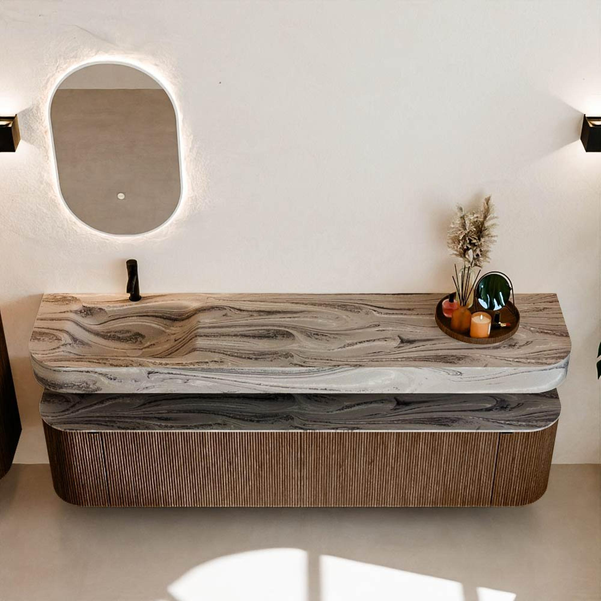 Matériaux naturels dans des tons chauds. Les nervures verticales apportent rythme et texture au design, tandis que le chêne confère une apparence chaleureuse et artisanale. Choisissez parmi 5 teintes de bois OAK, WALNUT, DUSK, SHADOW et RUBY, des couleurs de bois soigneusement sélectionnées pour enrichir les salles de bains modernes et classiques.