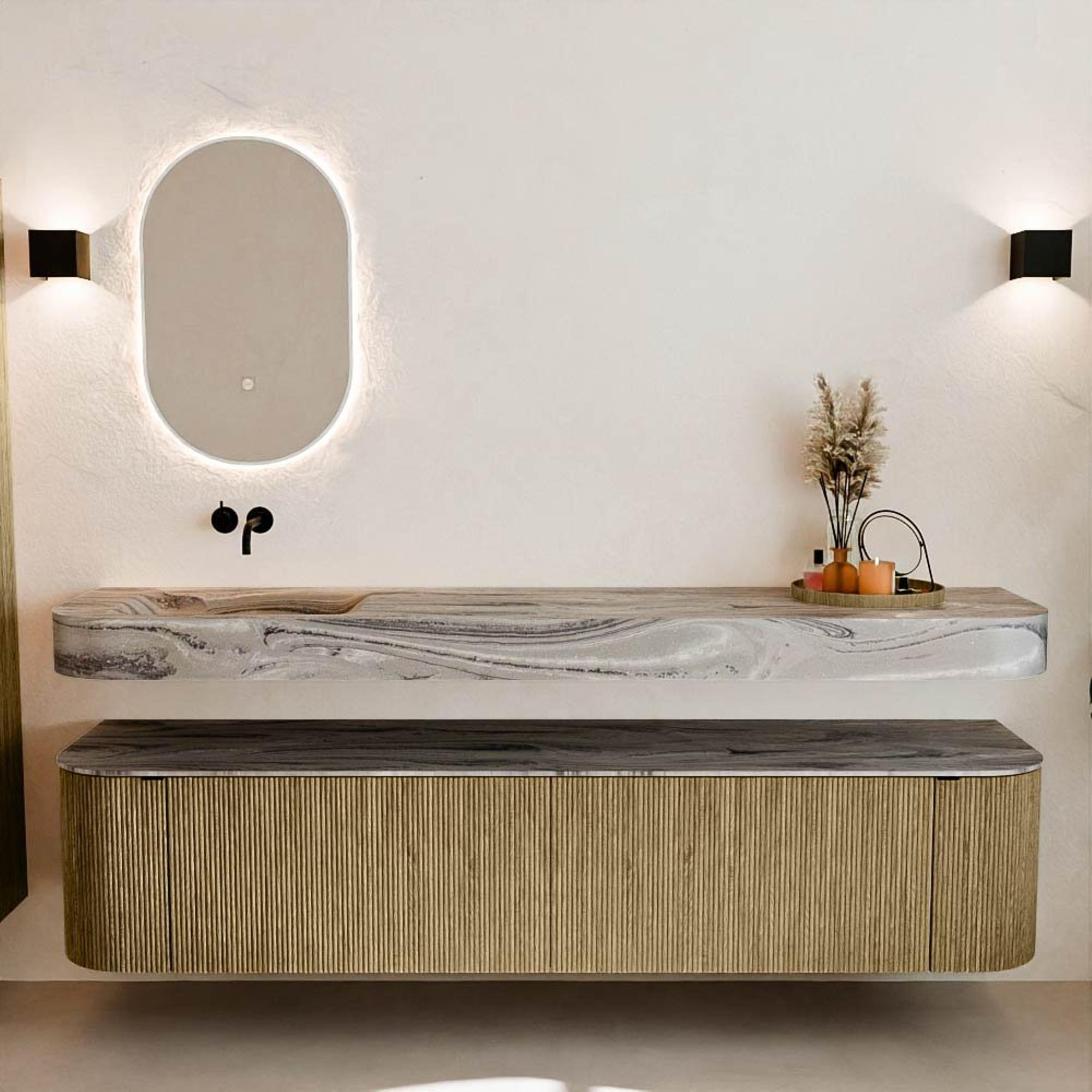 Matériaux naturels dans des tons chauds. Les nervures verticales apportent rythme et texture au design, tandis que le chêne confère une apparence chaleureuse et artisanale. Choisissez parmi 5 teintes de bois OAK, WALNUT, DUSK, SHADOW et RUBY, des couleurs de bois soigneusement sélectionnées pour enrichir les salles de bains modernes et classiques.
