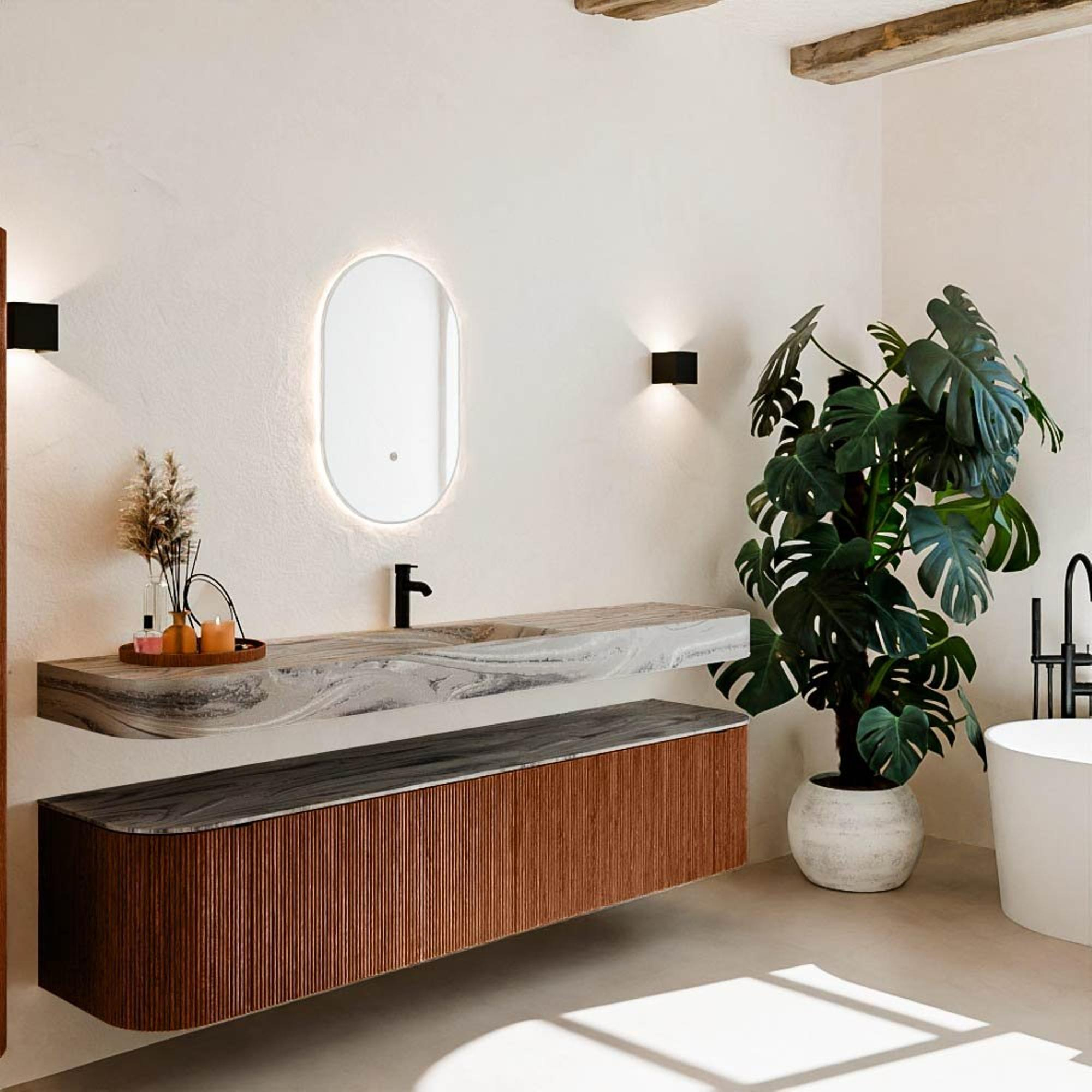 Matériaux naturels dans des tons chauds. Les nervures verticales apportent rythme et texture au design, tandis que le chêne confère une apparence chaleureuse et artisanale. Choisissez parmi 5 teintes de bois OAK, WALNUT, DUSK, SHADOW et RUBY, des couleurs de bois soigneusement sélectionnées pour enrichir les salles de bains modernes et classiques.
