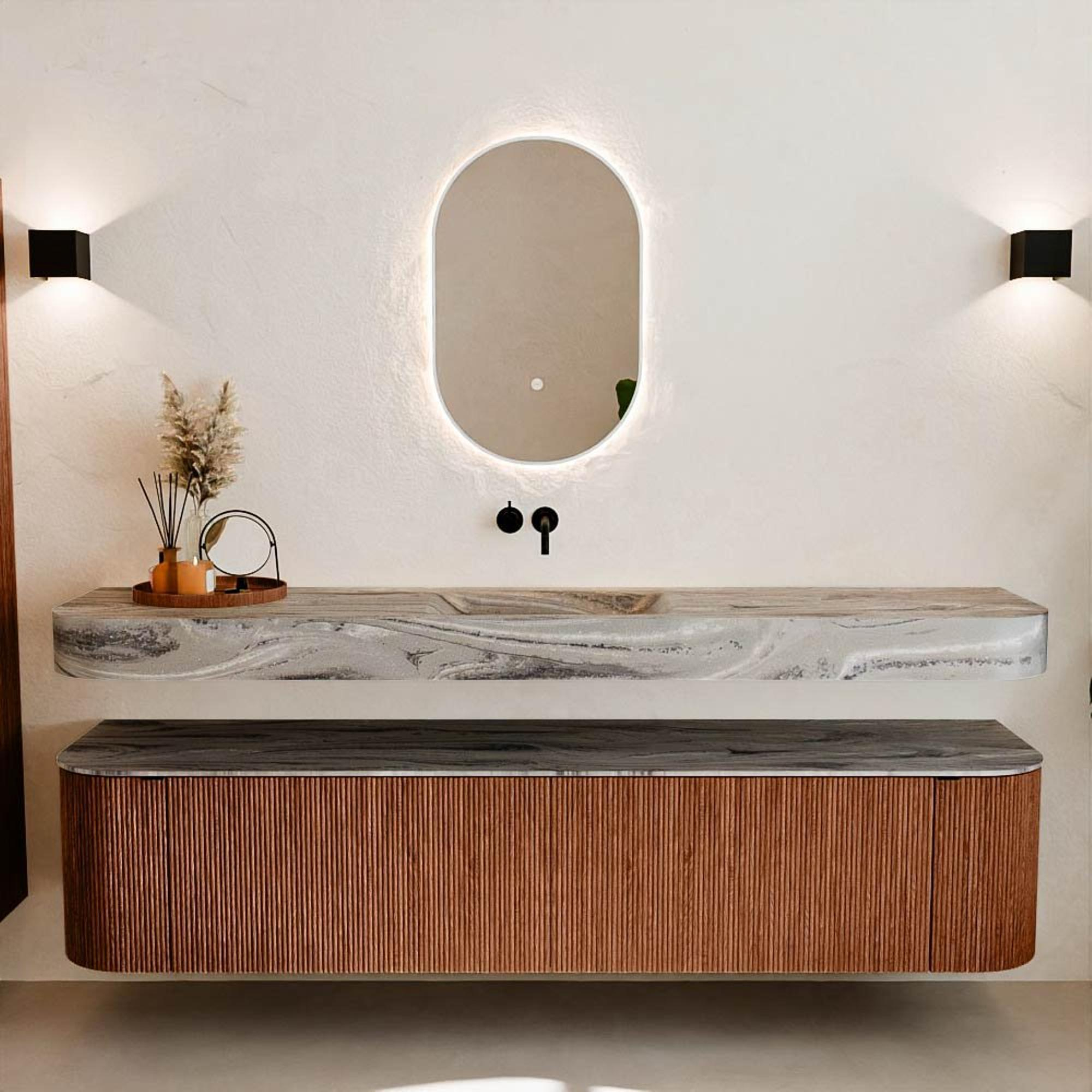 Matériaux naturels dans des tons chauds. Les nervures verticales apportent rythme et texture au design, tandis que le chêne confère une apparence chaleureuse et artisanale. Choisissez parmi 5 teintes de bois OAK, WALNUT, DUSK, SHADOW et RUBY, des couleurs de bois soigneusement sélectionnées pour enrichir les salles de bains modernes et classiques.
