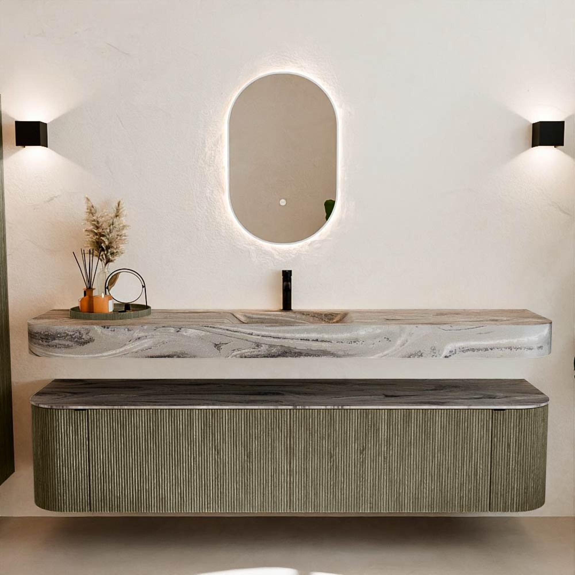 Au-dessus du meuble flotte une vasque suspendue assortie aux coins arrondis – parfaitement adaptée à la forme du meuble. La vasque est réalisée en Solid Surface et suit subtilement les lignes du meuble inférieur, créant ainsi un ensemble harmonieux. Le plan de travail en Solid Surface forme une base solide, facile d'entretien, et complète la combinaison.