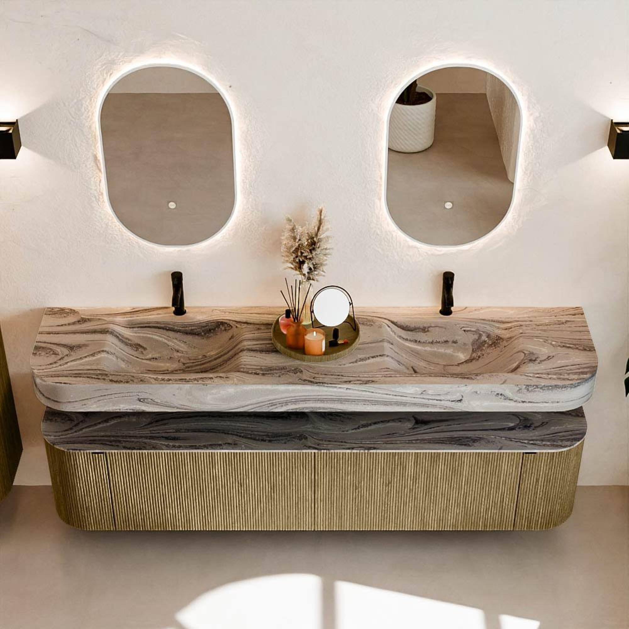 Matériaux naturels dans des tons chauds. Les nervures verticales apportent rythme et texture au design, tandis que le chêne confère une apparence chaleureuse et artisanale. Choisissez parmi 5 teintes de bois OAK, WALNUT, DUSK, SHADOW et RUBY, des couleurs de bois soigneusement sélectionnées pour enrichir les salles de bains modernes et classiques.