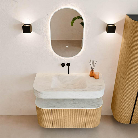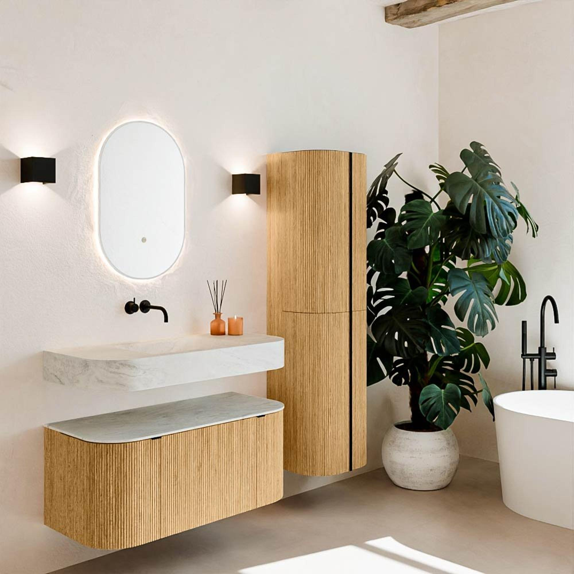 Matériaux naturels dans des tons chauds. Les cannelures verticales apportent rythme et texture au design, tandis que le chêne confère une apparence chaleureuse et artisanale. Choisissez parmi 5 teintes de bois OAK, WALNUT, DUSK, SHADOW et RUBY, des couleurs de bois soigneusement sélectionnées pour enrichir les salles de bains modernes et classiques.