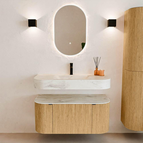 MONDIAZ THOR-DLUX 100cm meuble de salle de bains arrondi gauche + droite couleur Oak avec 1 tiroir et 2 portes. Vasque suspendue CLOUD Milieu 1 trou de robinet couleur Ostra.