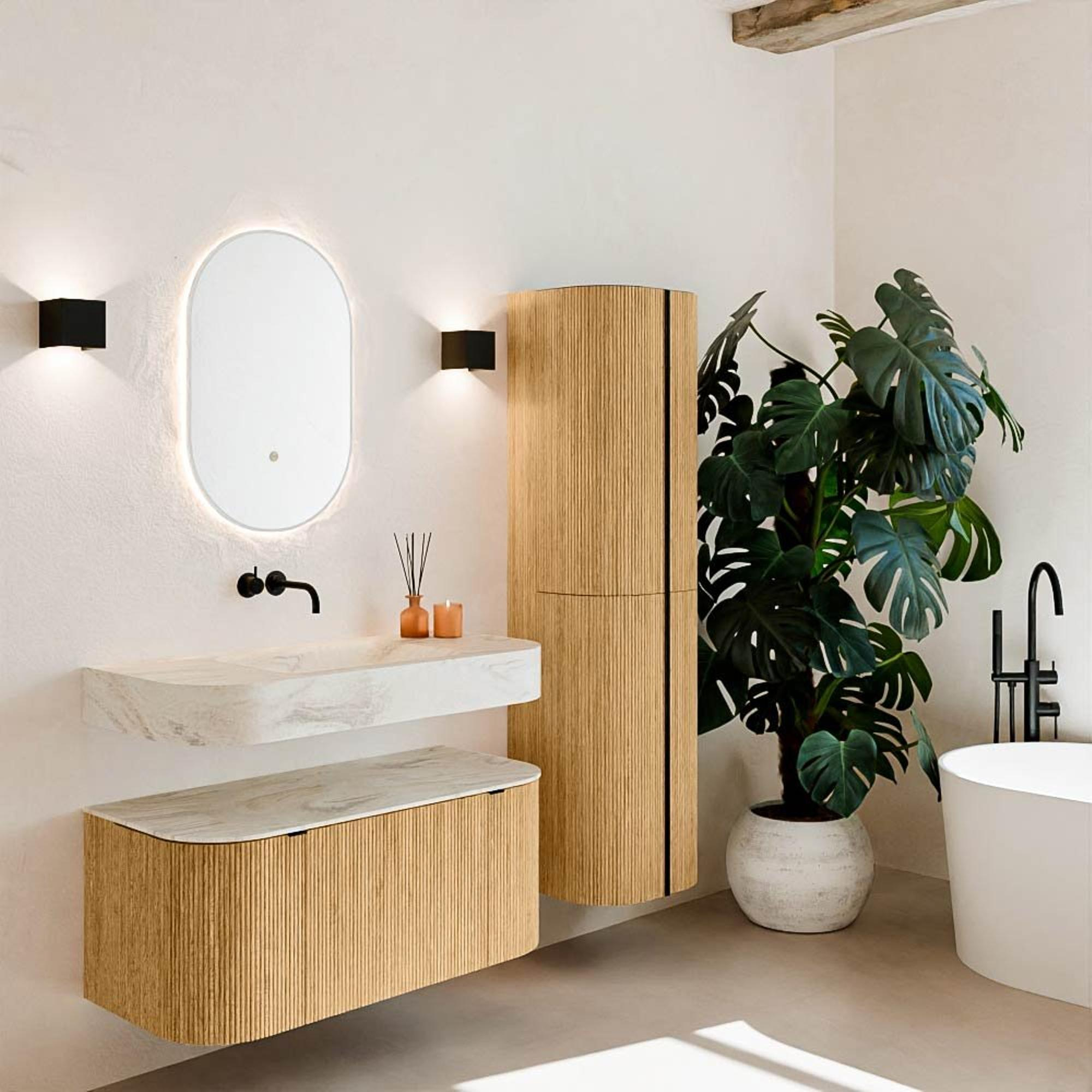 Matériaux naturels dans des tons chauds. Les nervures verticales apportent rythme et texture au design, tandis que le chêne confère une apparence chaleureuse et artisanale. Choisissez parmi 5 teintes de bois OAK, WALNUT, DUSK, SHADOW et RUBY, des couleurs de bois soigneusement sélectionnées pour enrichir les salles de bains modernes et classiques.