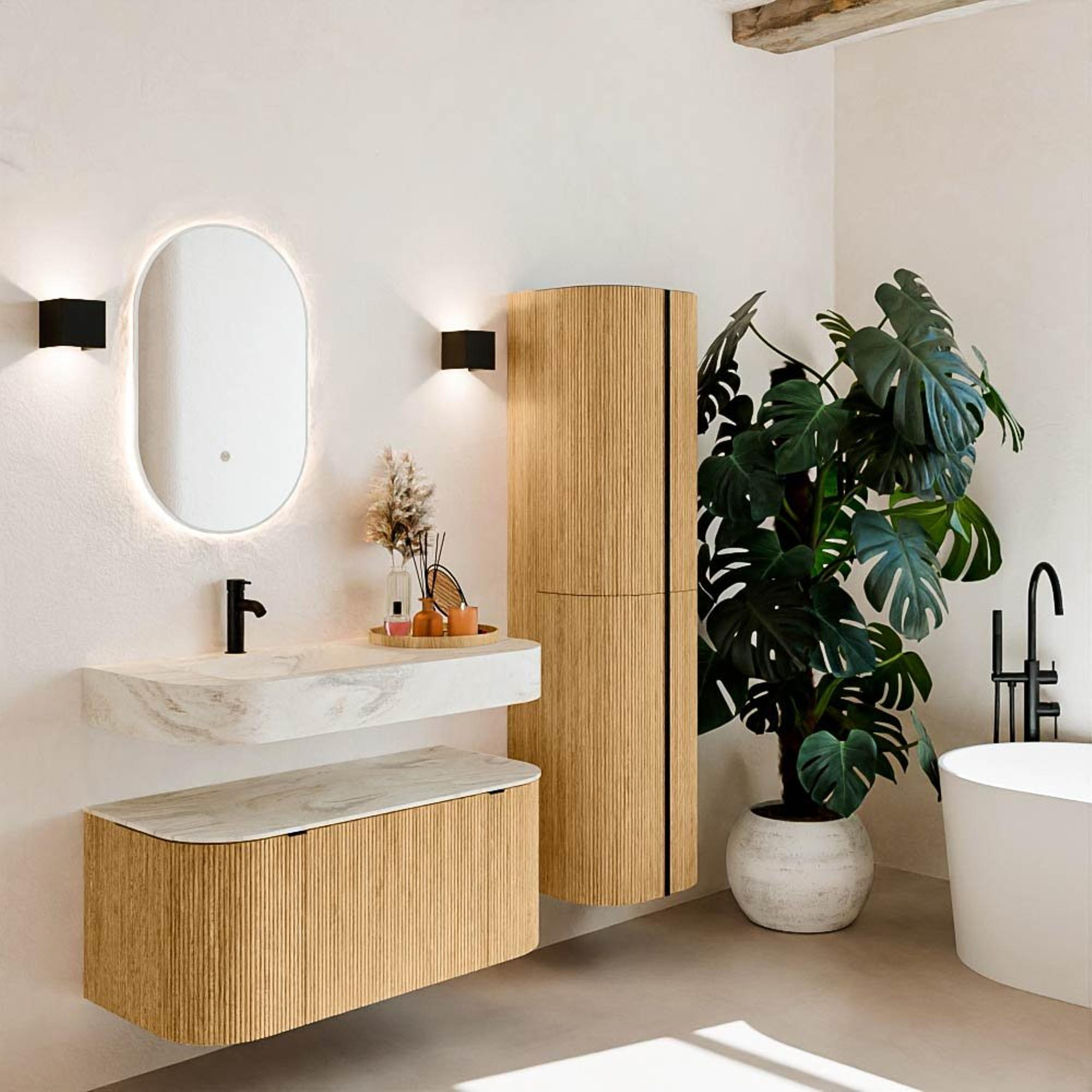 Matériaux naturels dans des tons chauds. Les cannelures verticales apportent rythme et texture au design, tandis que le chêne confère une apparence chaleureuse et artisanale. Choisissez parmi 5 teintes de bois OAK, WALNUT, DUSK, SHADOW et RUBY, des couleurs de bois soigneusement sélectionnées pour enrichir les salles de bains modernes et classiques.