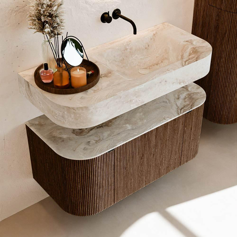 MONDIAZ THOR-DLUX 100cm meuble de salle de bains arrondi gauche + droite couleur Walnut avec 1 tiroir et 2 portes. Vasque suspendue CLOUD droite sans trou de robinet couleur Frappe.