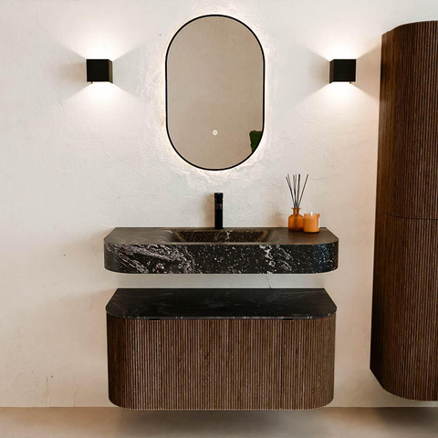Matériaux naturels dans des tons chauds. Les cannelures verticales apportent rythme et texture au design, tandis que le chêne confère une apparence chaleureuse et artisanale. Choisissez parmi 5 teintes de bois OAK, WALNUT, DUSK, SHADOW et RUBY, des couleurs de bois soigneusement sélectionnées pour enrichir les salles de bains modernes et classiques.