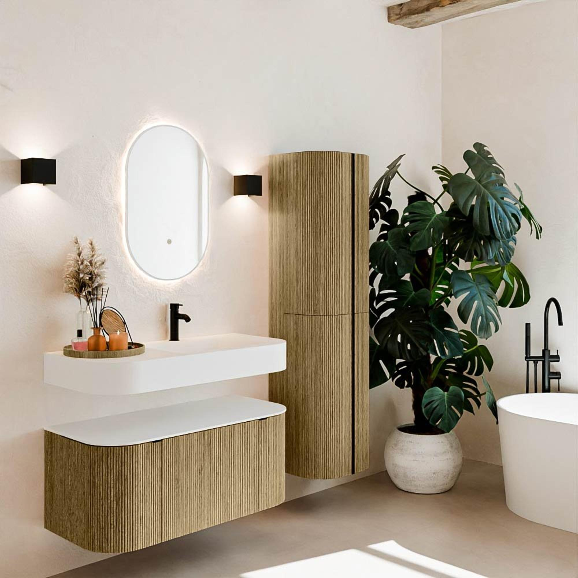 Matériaux naturels dans des tons chauds. Les rainures verticales apportent rythme et texture au design, tandis que le chêne confère une apparence chaleureuse et artisanale. Choisissez parmi 5 teintes de bois OAK, WALNUT, DUSK, SHADOW et RUBY, des couleurs de bois soigneusement sélectionnées pour enrichir les salles de bains modernes et classiques.