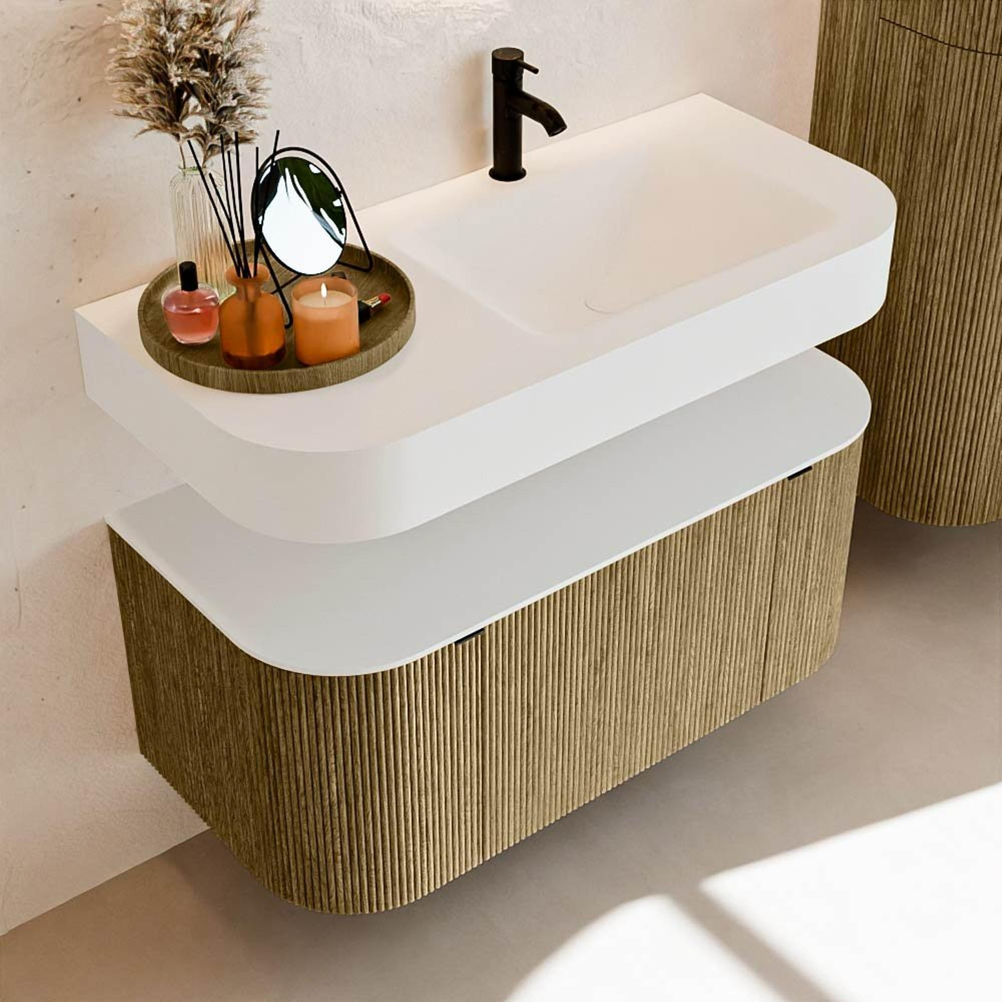 Au-dessus du meuble flotte une vasque suspendue assortie aux coins arrondis – parfaitement adaptée à la forme du meuble. La vasque est réalisée en Solid Surface et suit subtilement les lignes du meuble sous-jacent, créant une harmonie parfaite. Le plan de travail en Solid Surface constitue une base solide et facile d'entretien et complète la combinaison.