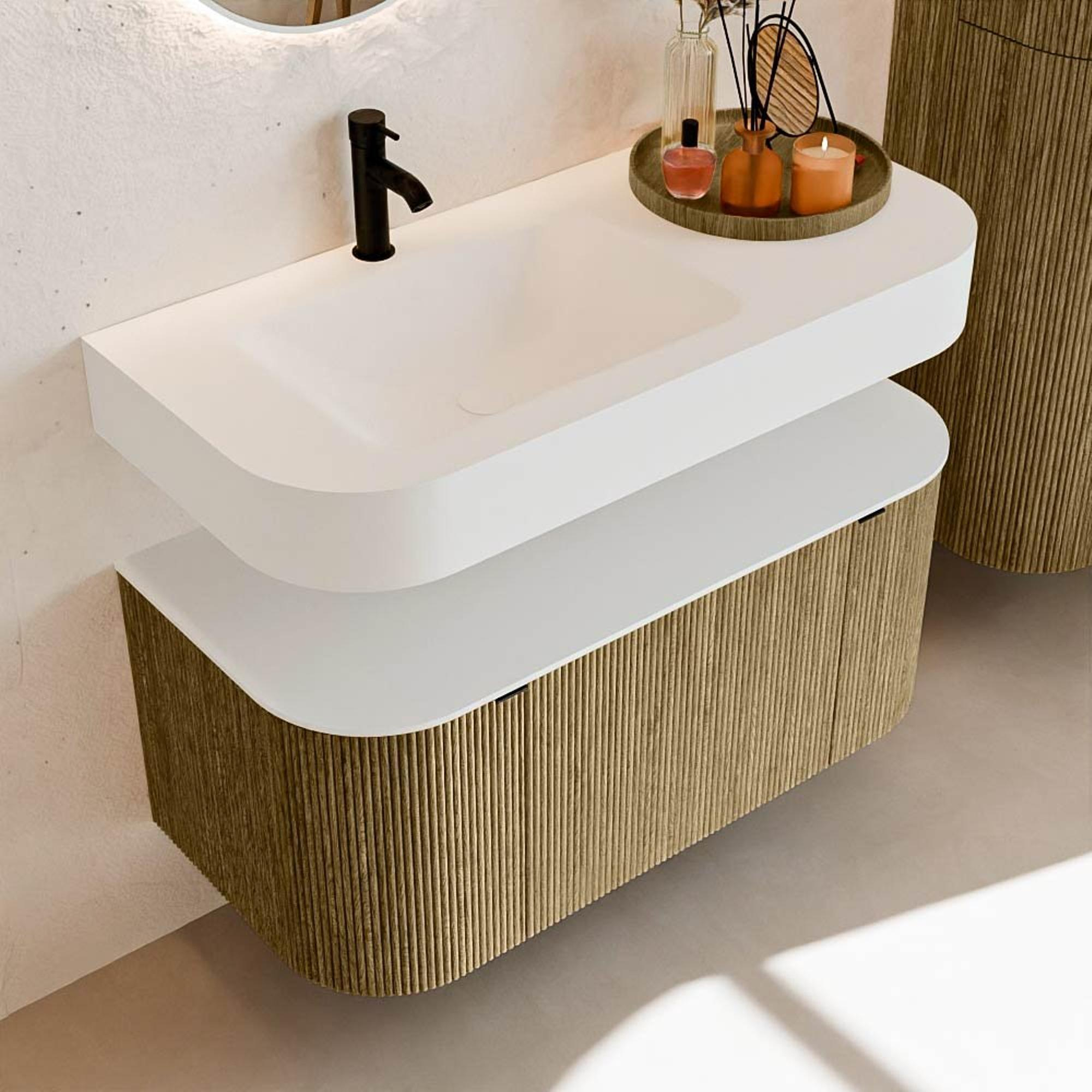 Au-dessus du meuble flotte une vasque suspendue assortie aux coins arrondis – parfaitement adaptée à la forme du meuble. La vasque est en Solid Surface et suit subtilement les lignes du meuble inférieur, créant un ensemble harmonieux. Le plan de travail en Solid Surface constitue une base solide et facile d'entretien, complétant la combinaison.