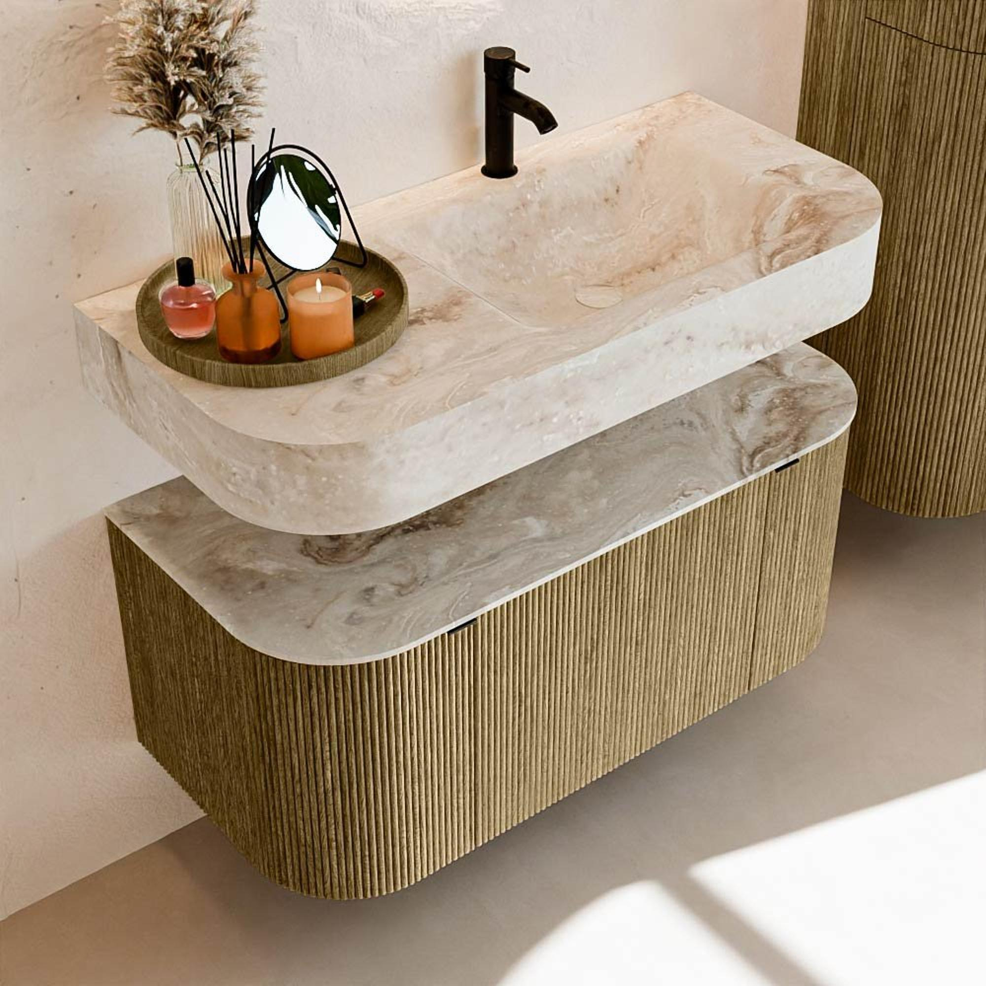 MONDIAZ THOR-DLUX 100cm meuble de salle de bains arrondi gauche + droite couleur Dusk avec 1 tiroir et 2 portes. Vasque suspendue CLOUD droite 1 trou de robinet couleur Frappe.