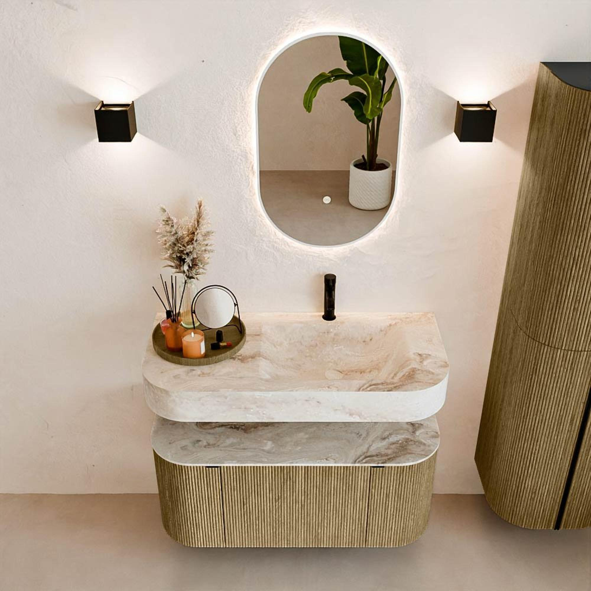 Matériaux naturels aux teintes chaudes. Les nervures verticales apportent rythme et texture au design, tandis que le chêne confère une apparence chaleureuse et artisanale. Choisissez parmi 5 teintes de bois OAK, WALNUT, DUSK, SHADOW et RUBY, des couleurs de bois soigneusement sélectionnées pour enrichir les salles de bains modernes et classiques.