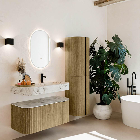 Matériaux naturels dans des tons chauds. Les nervures verticales apportent rythme et texture au design, tandis que le chêne confère une apparence chaleureuse et artisanale. Choisissez parmi 5 teintes de bois OAK, WALNUT, DUSK, SHADOW et RUBY, des couleurs de bois soigneusement sélectionnées pour enrichir les salles de bains modernes et classiques.
