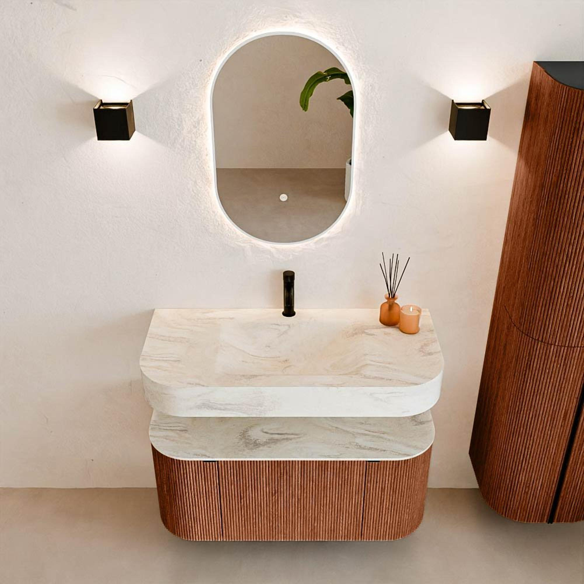 Au-dessus du meuble flotte une vasque suspendue assortie aux coins arrondis – parfaitement adaptée à la forme du meuble. La vasque est en Solid Surface et suit subtilement les lignes du meuble inférieur, créant ainsi un ensemble harmonieux. Le plan de travail en Solid Surface constitue une base solide et facile d'entretien, complétant la combinaison.