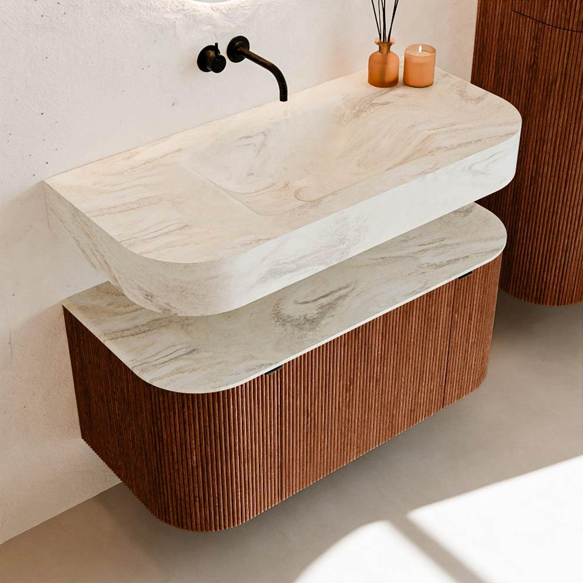 Au-dessus du meuble flotte une vasque suspendue assortie aux coins arrondis – parfaitement adaptée à la forme du meuble. La vasque est en Solid Surface et suit subtilement les lignes du meuble inférieur, créant ainsi un ensemble harmonieux. Le plan de travail en Solid Surface forme une base solide, facile d'entretien, et complète la combinaison.