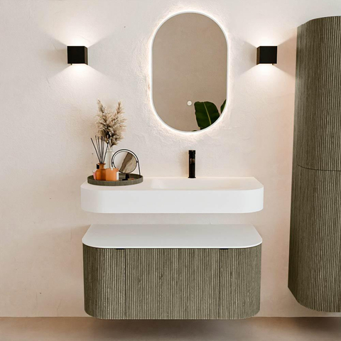 Au-dessus du meuble flotte une vasque suspendue assortie aux coins arrondis – parfaitement adaptée à la forme du meuble. La vasque est réalisée en Solid Surface et suit subtilement les lignes du meuble inférieur, créant ainsi un ensemble harmonieux. Le plan de travail en Solid Surface constitue une base solide et facile d'entretien, complétant la combinaison.