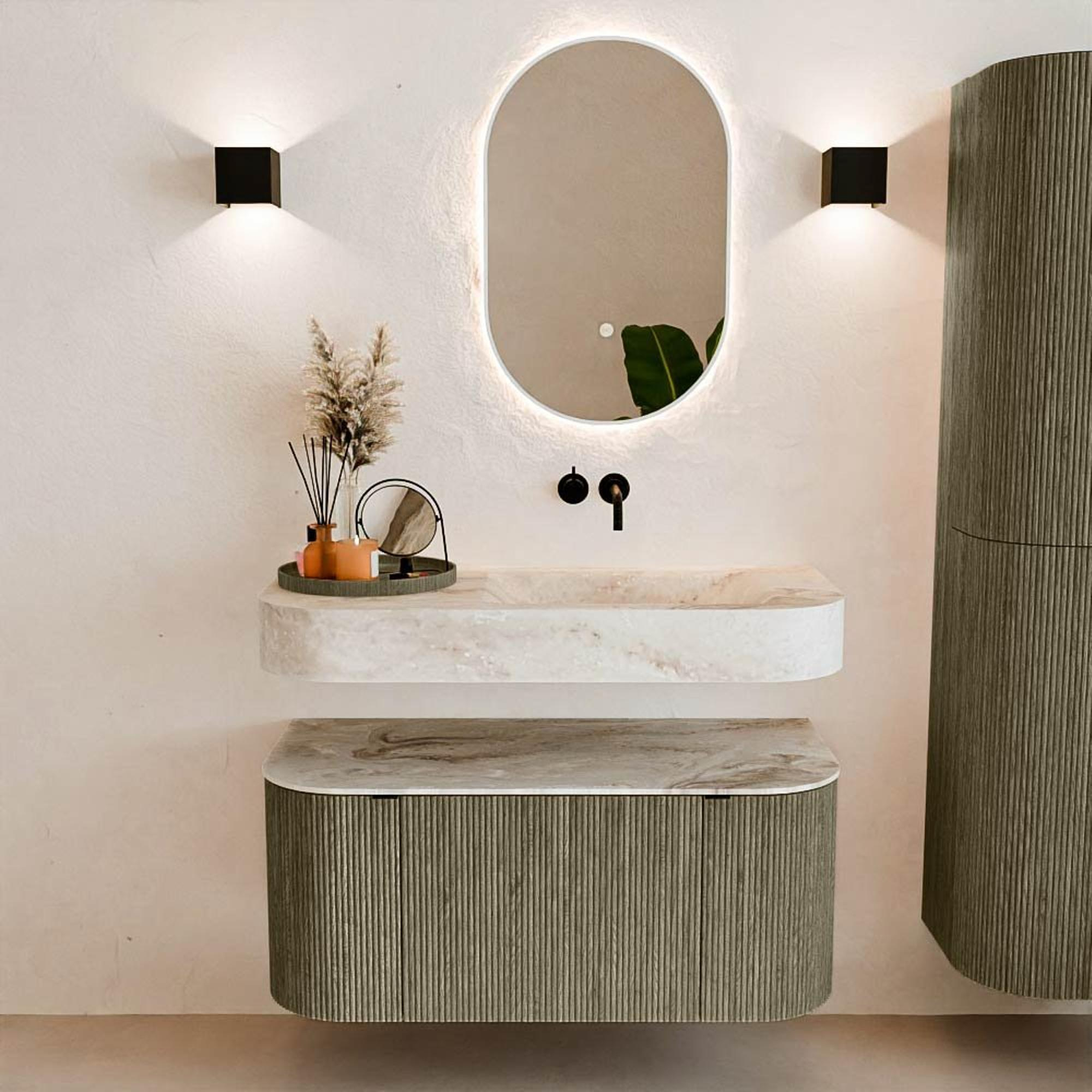 Au-dessus du meuble flotte une vasque suspendue assortie aux coins arrondis – parfaitement adaptée à la forme du meuble. La vasque est réalisée en Solid Surface et suit subtilement les lignes du meuble inférieur, créant un ensemble harmonieux. Le plan de travail en Solid Surface forme une base solide et facile d'entretien et complète la combinaison.