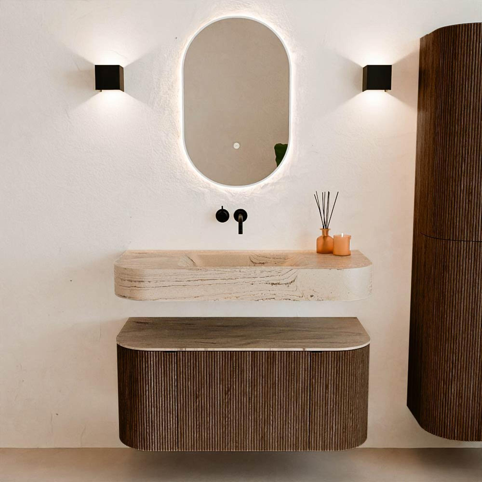 MONDIAZ THOR-DLUX 100cm meuble de salle de bains arrondi gauche + droite couleur Walnut avec 1 tiroir et 2 portes. Vasque suspendue CLOUD Centre sans trou de robinet couleur Arena.