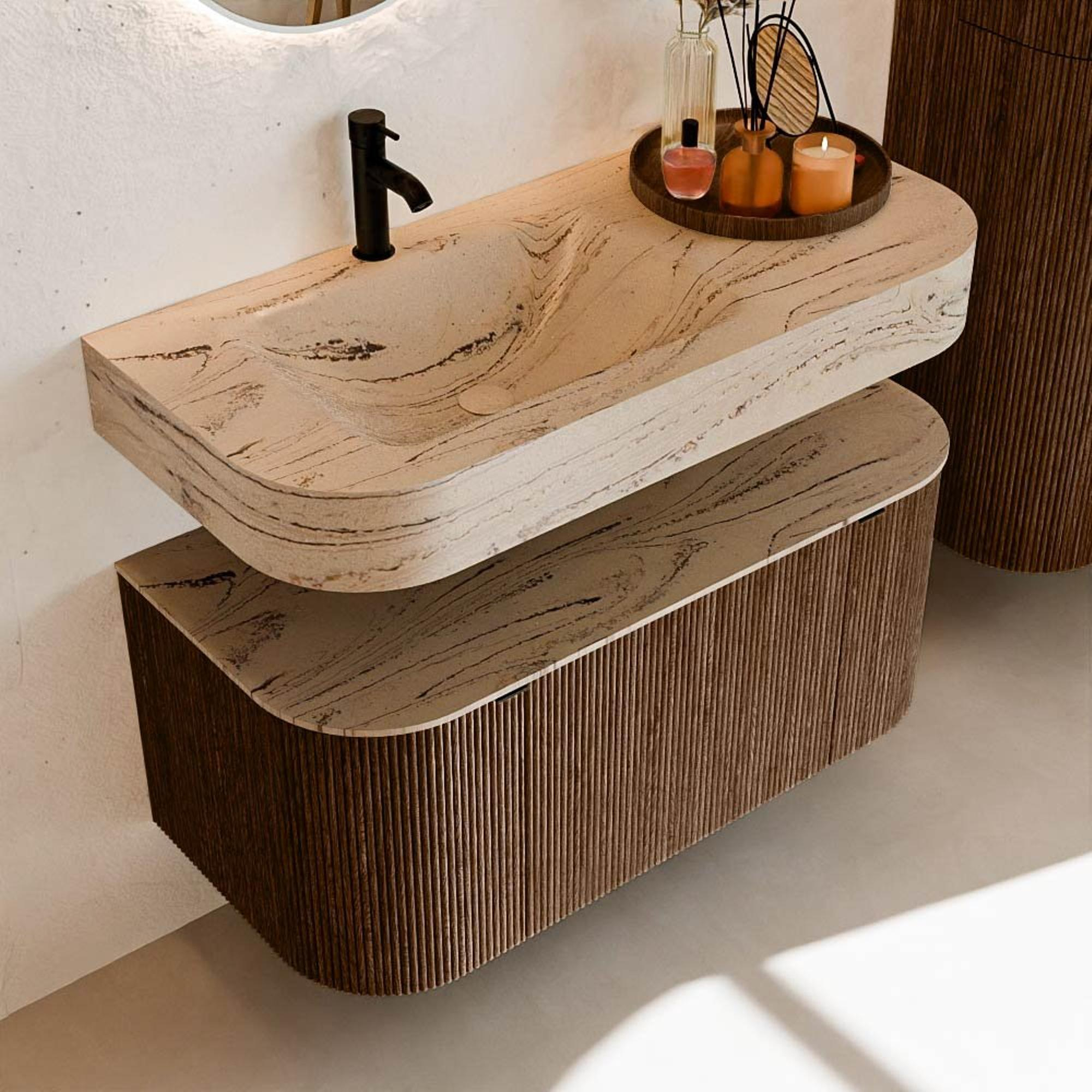 Matériaux naturels dans des tons chauds. Les nervures verticales apportent rythme et texture au design, tandis que le chêne confère une apparence chaleureuse et artisanale. Choisissez parmi 5 teintes de bois OAK, WALNUT, DUSK, SHADOW et RUBY, des couleurs de bois soigneusement sélectionnées pour enrichir les salles de bains modernes et classiques.