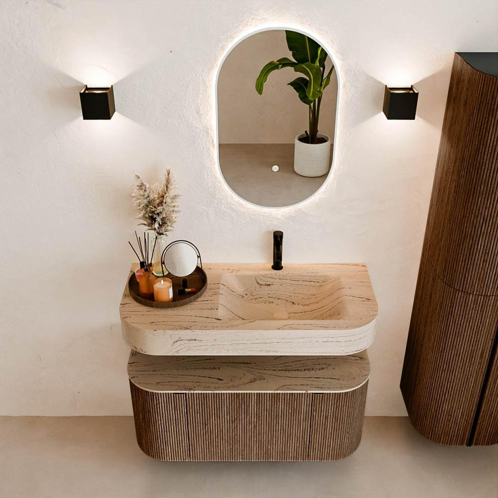 Matériaux naturels dans des tons chauds. Les rainures verticales apportent rythme et texture au design, tandis que le chêne confère une apparence chaleureuse et artisanale. Choisissez parmi 5 teintes de bois OAK, WALNUT, DUSK, SHADOW et RUBY, des couleurs de bois soigneusement sélectionnées pour enrichir les salles de bains modernes et classiques.