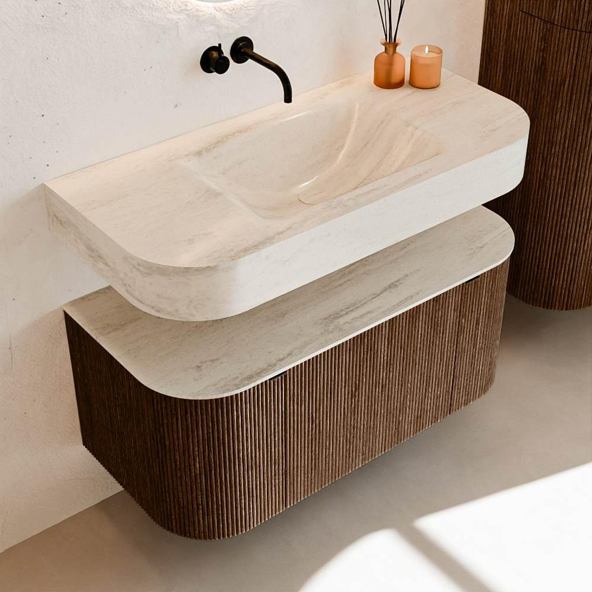 MONDIAZ THOR-DLUX 100cm meuble de salle de bains arrondi gauche + droite couleur Walnut avec 1 tiroir et 2 portes. Vasque suspendue CLOUD Milieu sans trou de robinet couleur Meli.