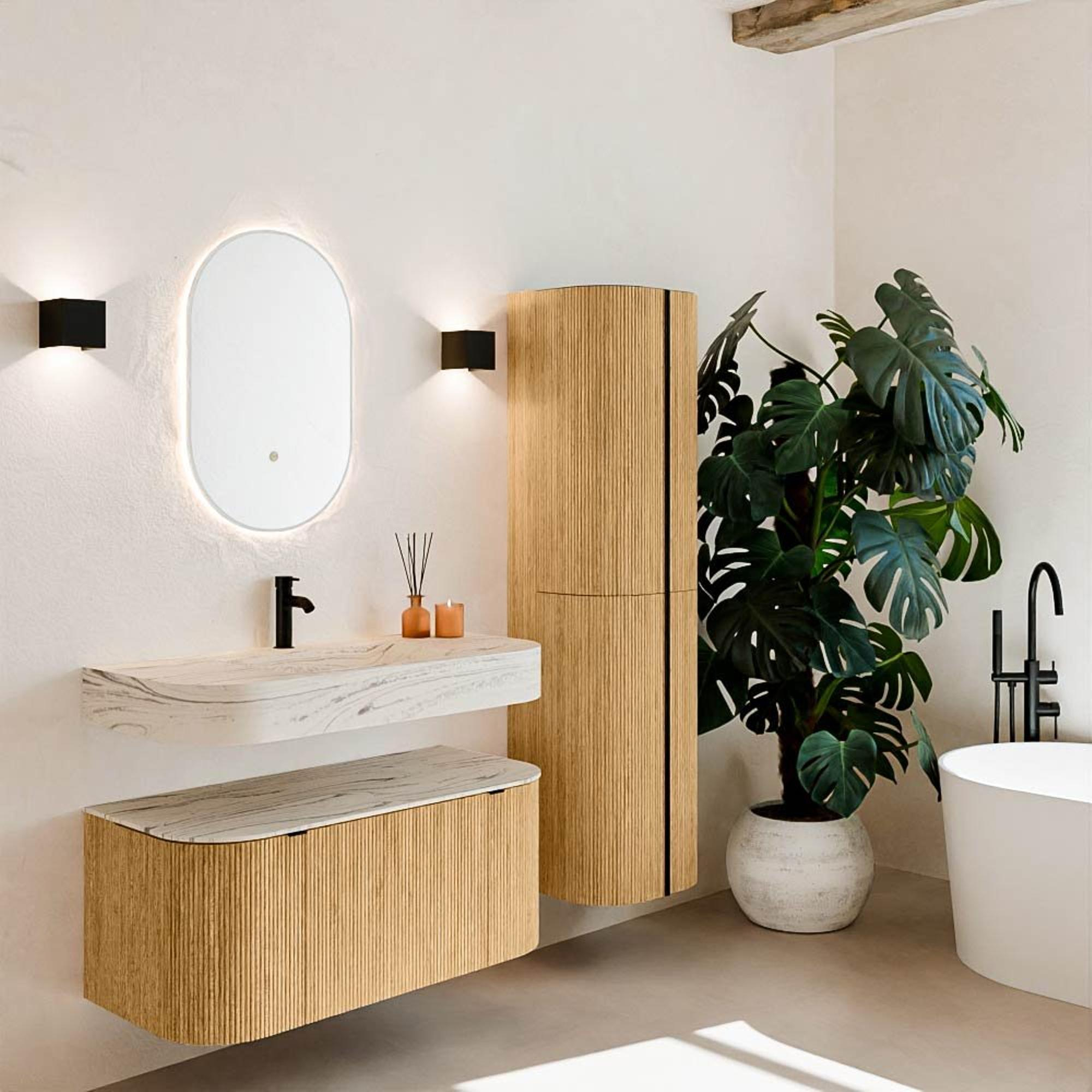 Matériaux naturels aux teintes chaudes. Les reliefs verticaux apportent rythme et texture au design, tandis que le chêne confère une apparence chaleureuse et artisanale. Choisissez parmi 5 teintes de bois OAK, WALNUT, DUSK, SHADOW et RUBY, des couleurs de bois soigneusement sélectionnées pour enrichir les salles de bains modernes et classiques.