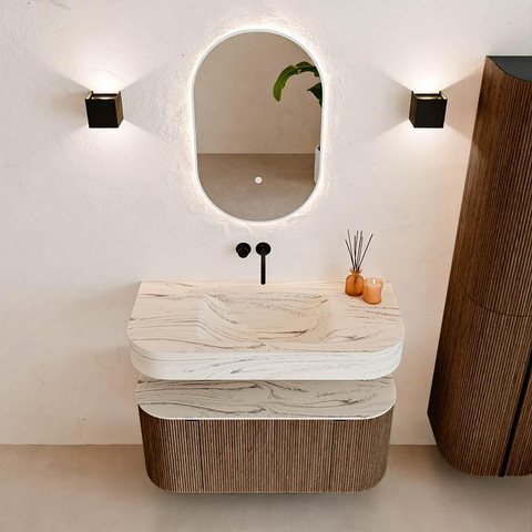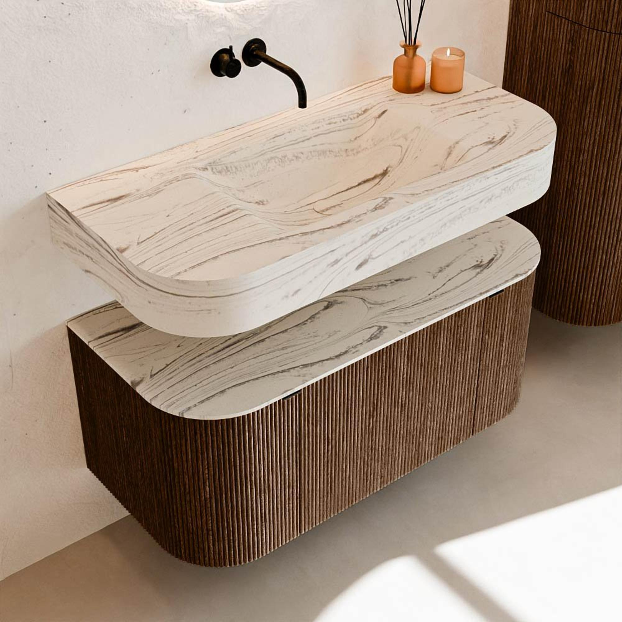 MONDIAZ THOR-DLUX 100cm meuble de salle de bains arrondi gauche + droite couleur Walnut avec 1 tiroir et 2 portes. Vasque suspendue CLOUD Milieu sans trou de robinet couleur Nata.