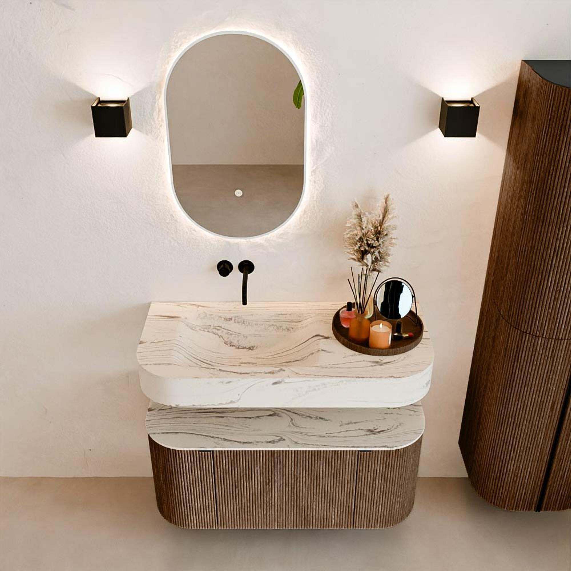 Matériaux naturels dans des tons chauds. Les nervures verticales apportent rythme et texture au design, tandis que le chêne confère une apparence chaleureuse et artisanale. Choisissez parmi 5 teintes de bois OAK, WALNUT, DUSK, SHADOW et RUBY, des couleurs de bois soigneusement sélectionnées pour enrichir les salles de bains modernes et classiques.