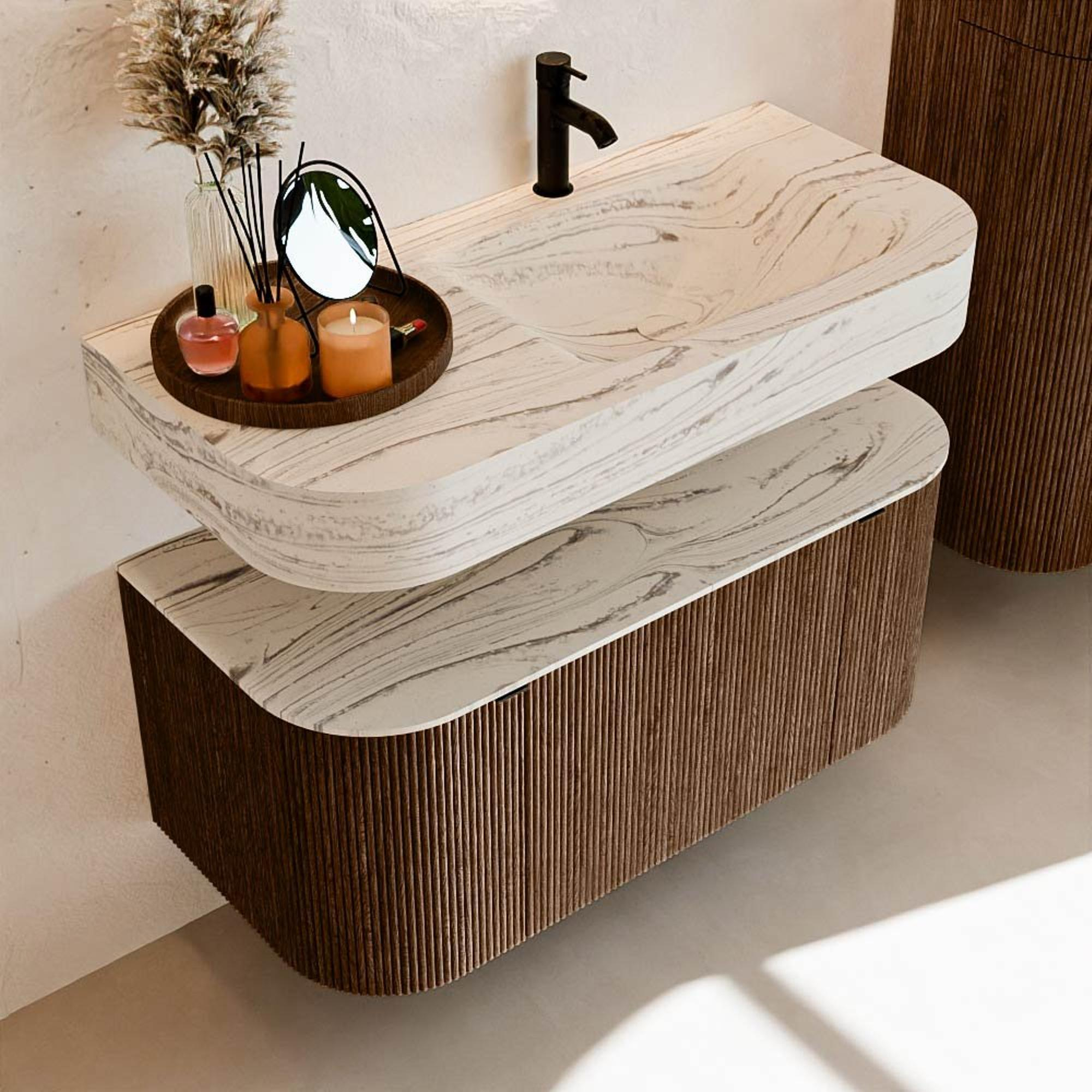 Au-dessus du meuble flotte une vasque suspendue assortie aux coins arrondis – parfaitement adaptée à la forme du meuble. La vasque est réalisée en Solid Surface et suit subtilement les lignes du meuble inférieur, créant ainsi un ensemble harmonieux. Le plan de travail en Solid Surface forme une base solide, facile d'entretien, et complète la combinaison.