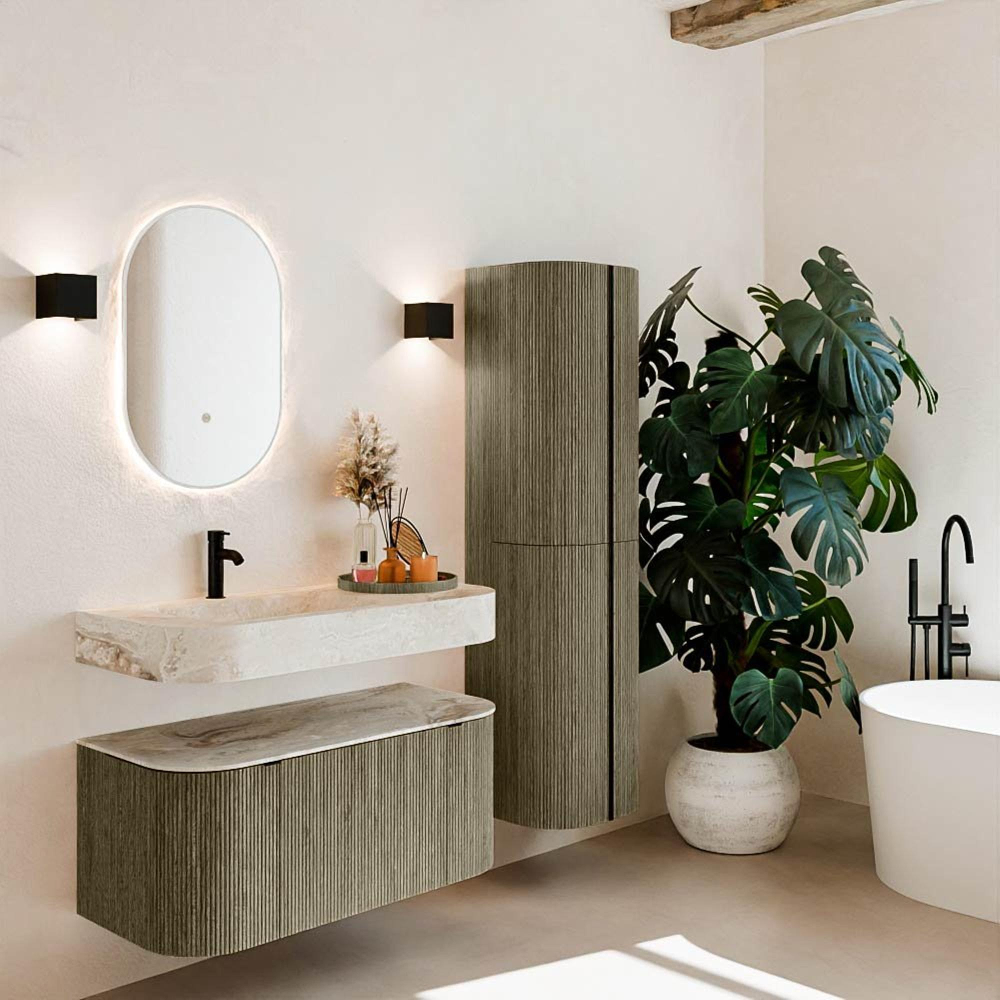 Matériaux naturels dans des tons chauds. Les nervures verticales apportent rythme et texture au design, tandis que le chêne confère une apparence chaleureuse et artisanale. Choisissez parmi 5 teintes de bois OAK, WALNUT, DUSK, SHADOW et RUBY, des couleurs de bois soigneusement sélectionnées pour enrichir les salles de bains modernes et classiques.