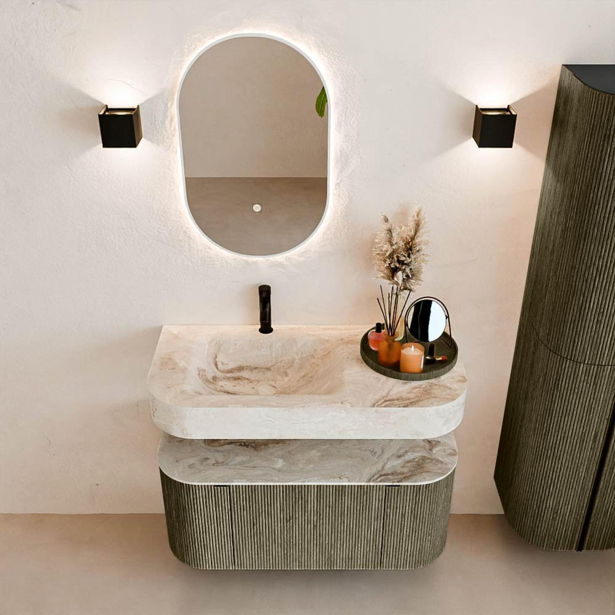 Au-dessus du meuble flotte une vasque suspendue assortie aux coins arrondis – parfaitement adaptée à la forme du meuble. La vasque est réalisée en Solid Surface et suit subtilement les lignes du meuble inférieur, créant ainsi un ensemble harmonieux. Le plan de travail en Solid Surface forme une base solide, facile d'entretien et complète la combinaison.