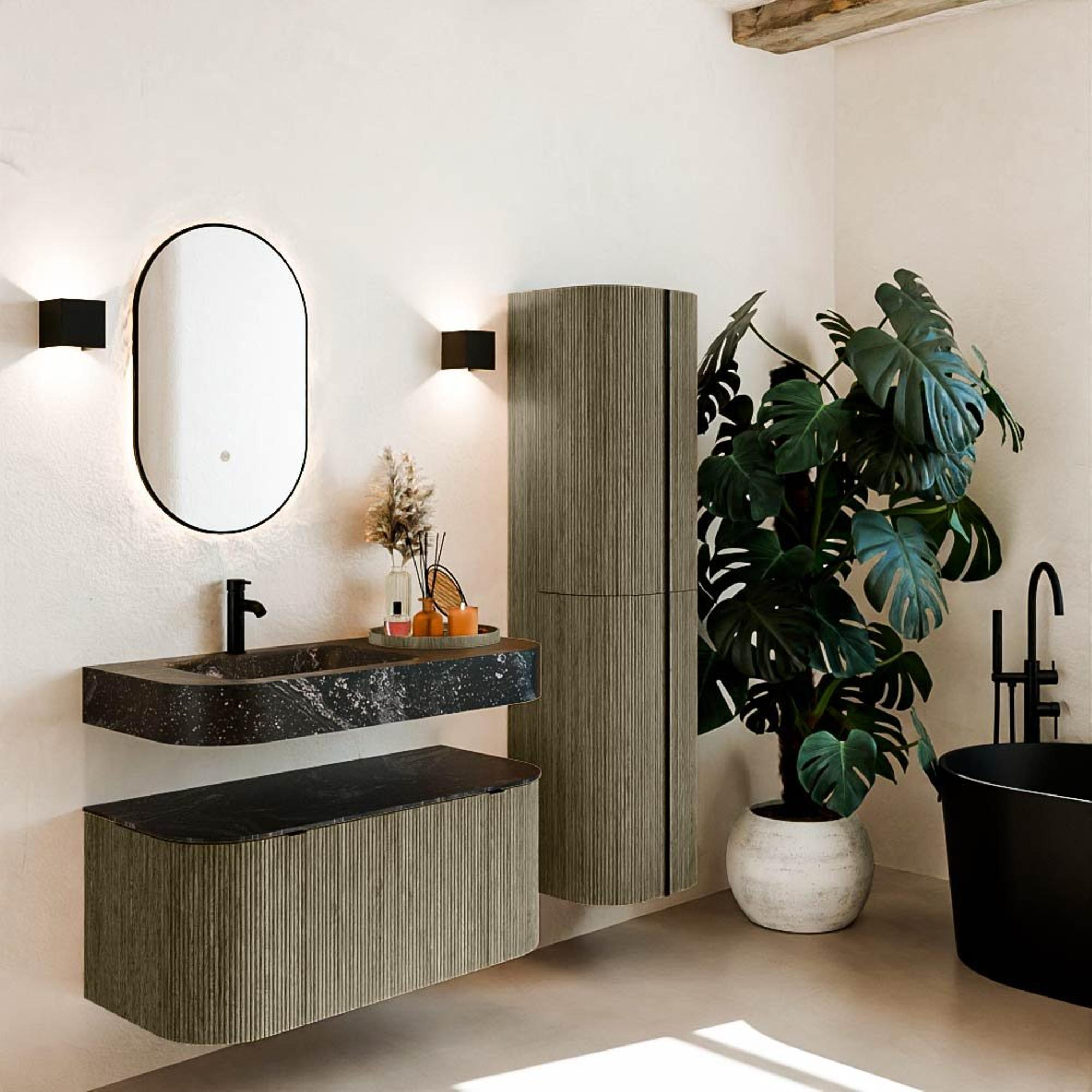 Matériaux naturels dans des tons chauds. Les nervures verticales apportent rythme et texture au design, tandis que le chêne confère une apparence chaleureuse et artisanale. Choisissez parmi 5 teintes de bois OAK, WALNUT, DUSK, SHADOW et RUBY, des couleurs de bois soigneusement sélectionnées pour enrichir les salles de bains modernes et classiques.