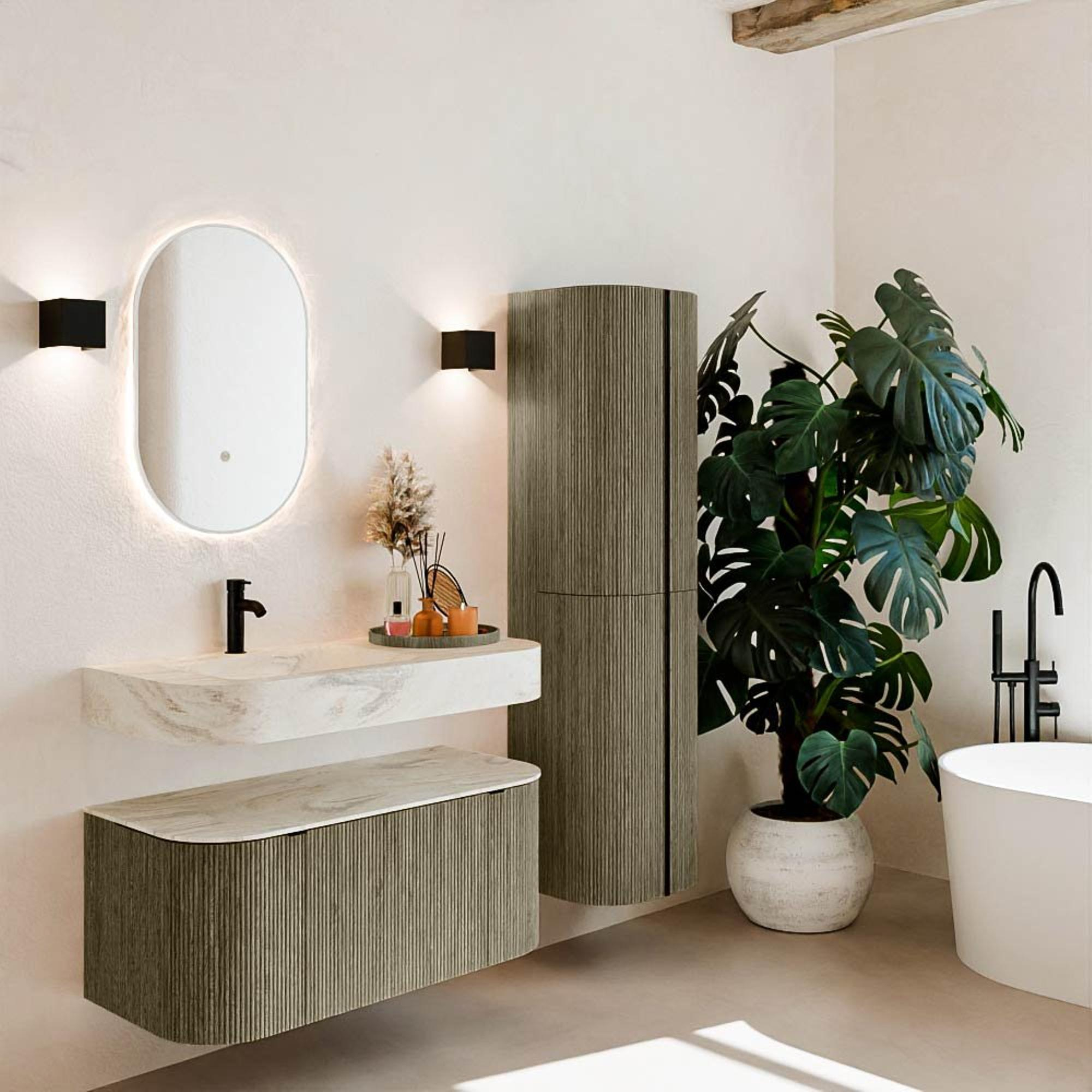 Matériaux naturels dans des tons chauds. Les cannelures verticales apportent rythme et texture au design, tandis que le chêne confère une apparence chaleureuse et artisanale. Choisissez parmi 5 teintes de bois OAK, WALNUT, DUSK, SHADOW et RUBY, des couleurs de bois soigneusement sélectionnées pour enrichir les salles de bains modernes et classiques.
