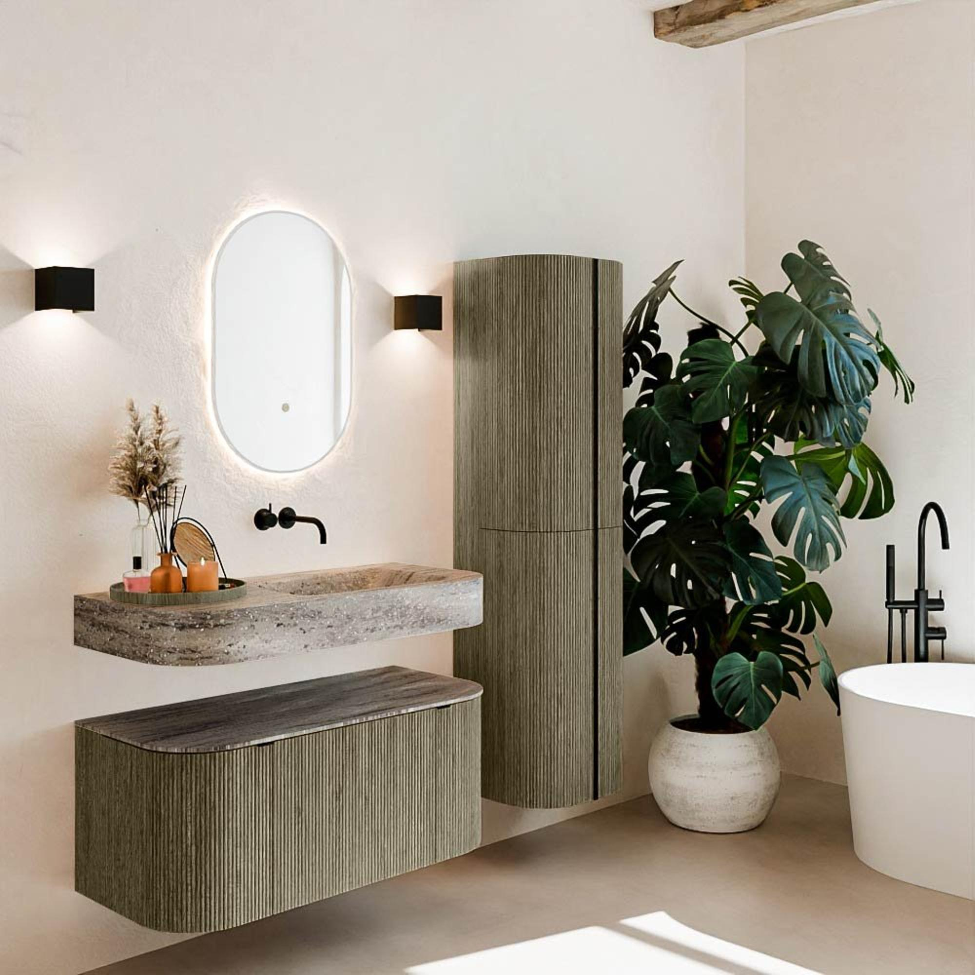 Matériaux naturels dans des tons chauds. Les nervures verticales apportent rythme et texture au design, tandis que le chêne confère une apparence chaleureuse et artisanale. Choisissez parmi 5 teintes de bois OAK, WALNUT, DUSK, SHADOW et RUBY, des couleurs de bois soigneusement sélectionnées pour enrichir les salles de bains modernes et classiques.