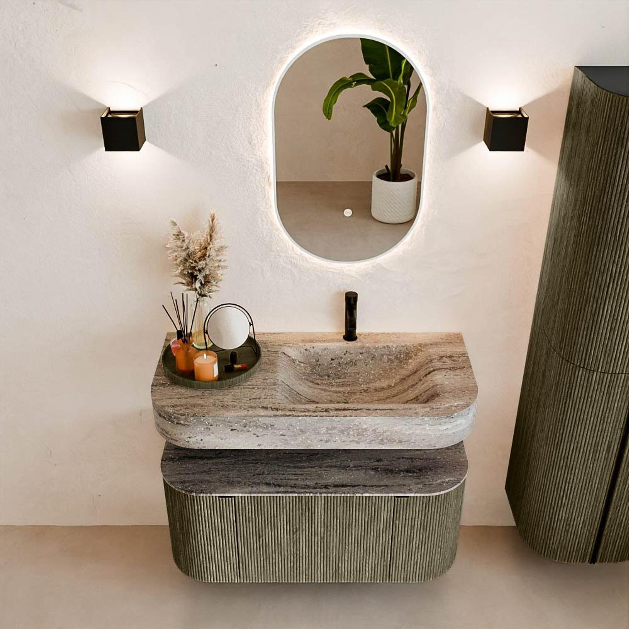 MONDIAZ THOR-DLUX 100cm meuble de salle de bains arrondi gauche + droite couleur Shadow avec 1 tiroir et 2 portes. Vasque suspendue CLOUD Droite 1 trou de robinet couleur Oza.